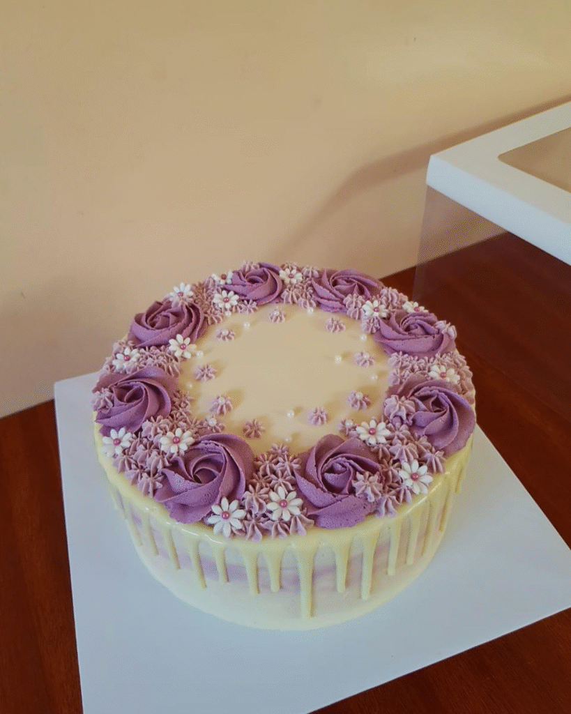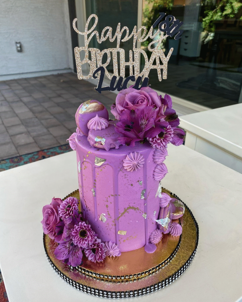 This cake features a gorgeous purple drip effect complemented by a sparkling “Happy Birthday” topper. Adorned with elegant floral arrangements of purple roses and other vibrant flowers, it’s a visually striking cake perfect for a milestone celebration.