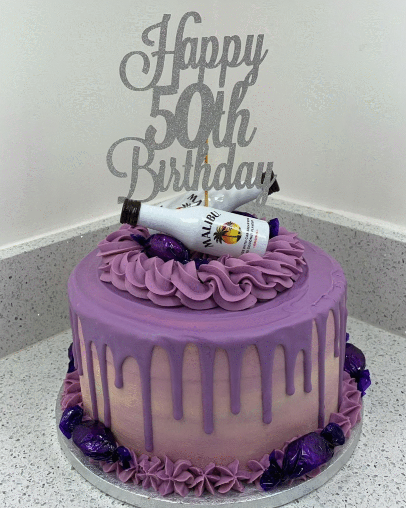 This 50th birthday cake stands out with a vibrant purple color, a glossy drip effect, and a Malibu bottle decorating the top. The “Happy 50th Birthday” topper adds the perfect celebratory touch, while the purple buttercream and candy accents complete the look.