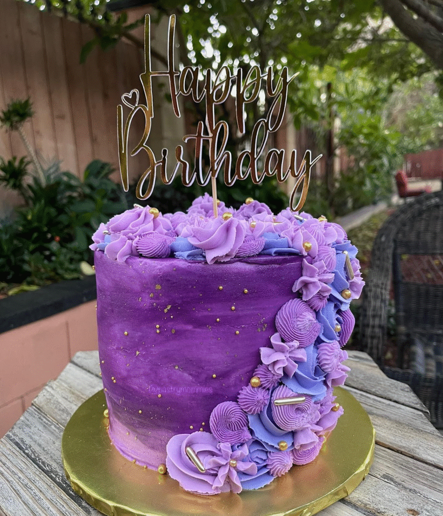 This beautiful birthday cake boasts a rich purple color, adorned with soft lavender and purple buttercream rosettes. The golden sprinkles and the elegant “Happy Birthday” topper elevate its charm, making it perfect for a memorable celebration.