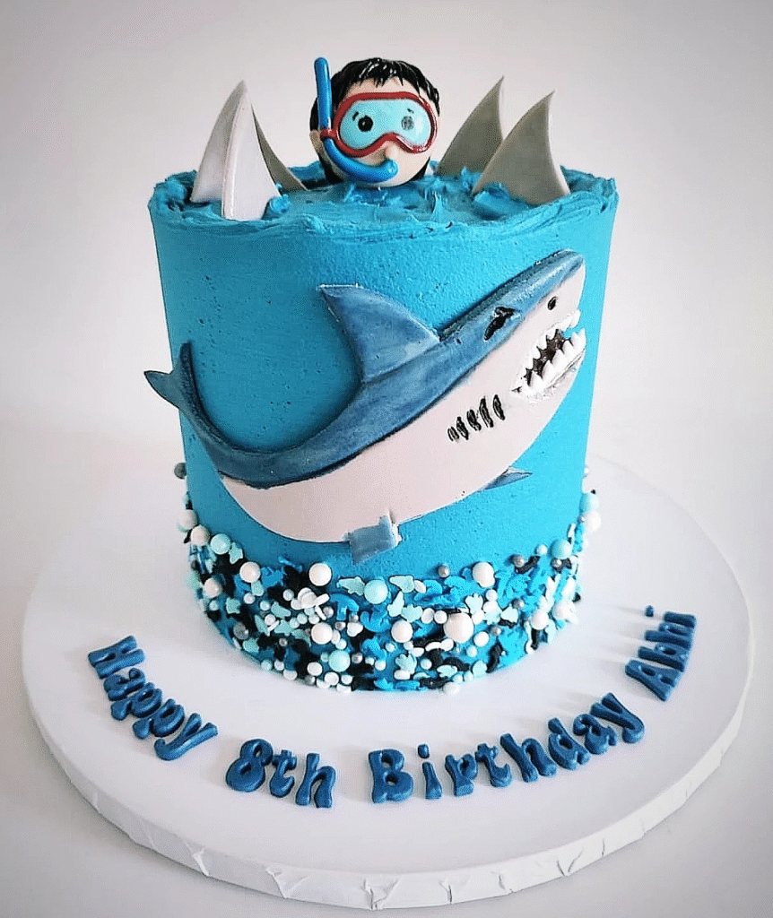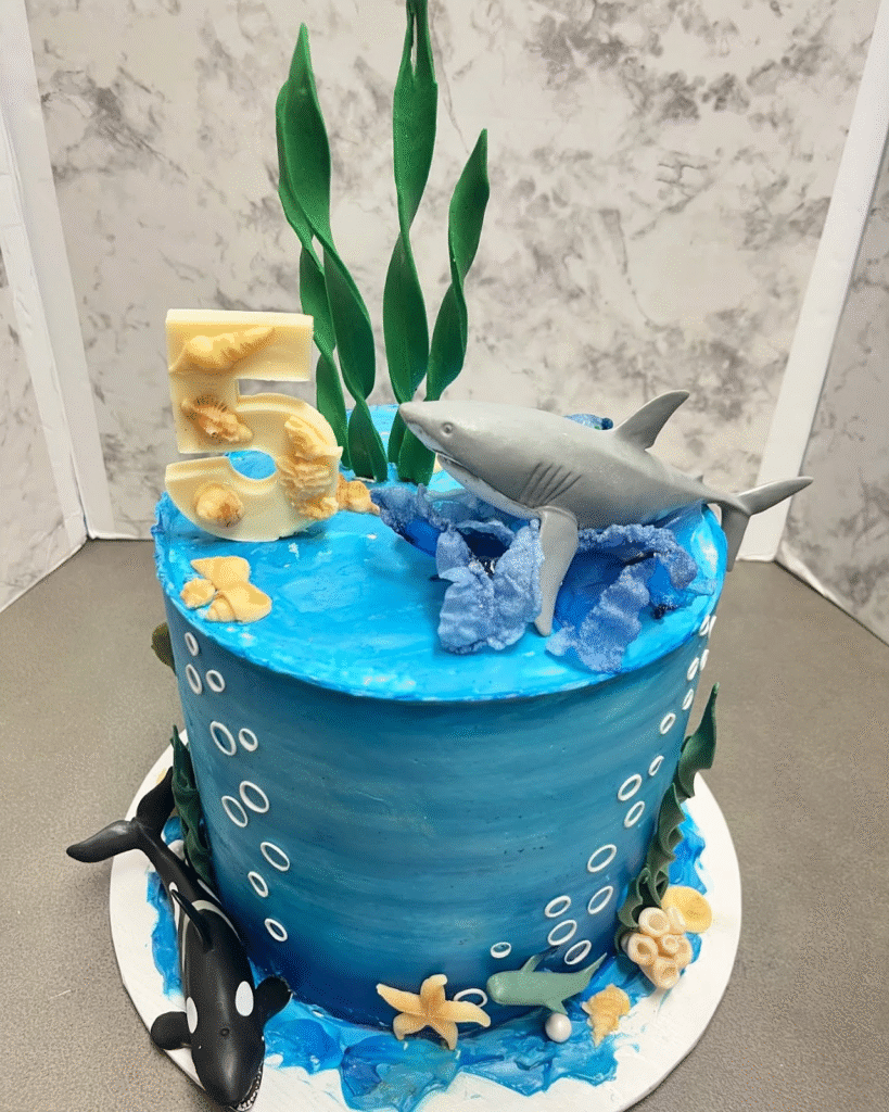 Nothing excites a birthday celebration like a cake inspired by the mysteries of the sea. Shark-themed cakes, decorated with fins, waves, and ocean details, instantly grab attention. They create a sense of adventure, turning the dessert table into an underwater spectacle.