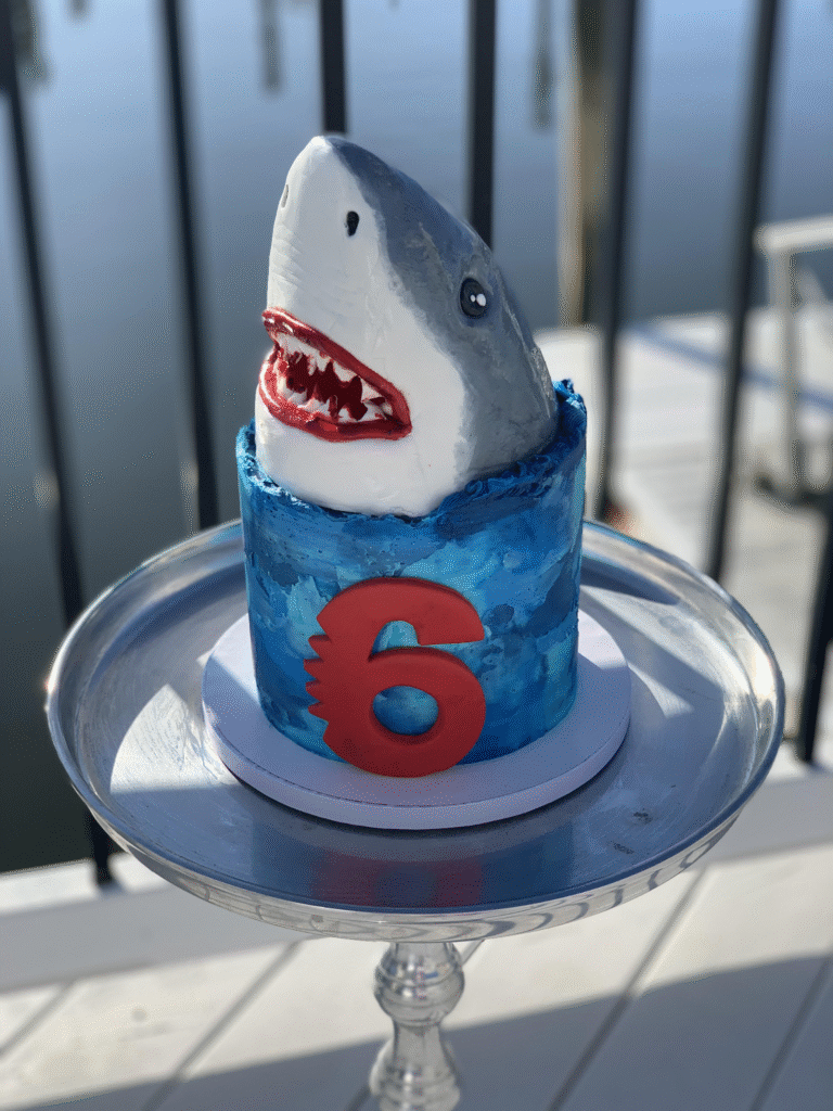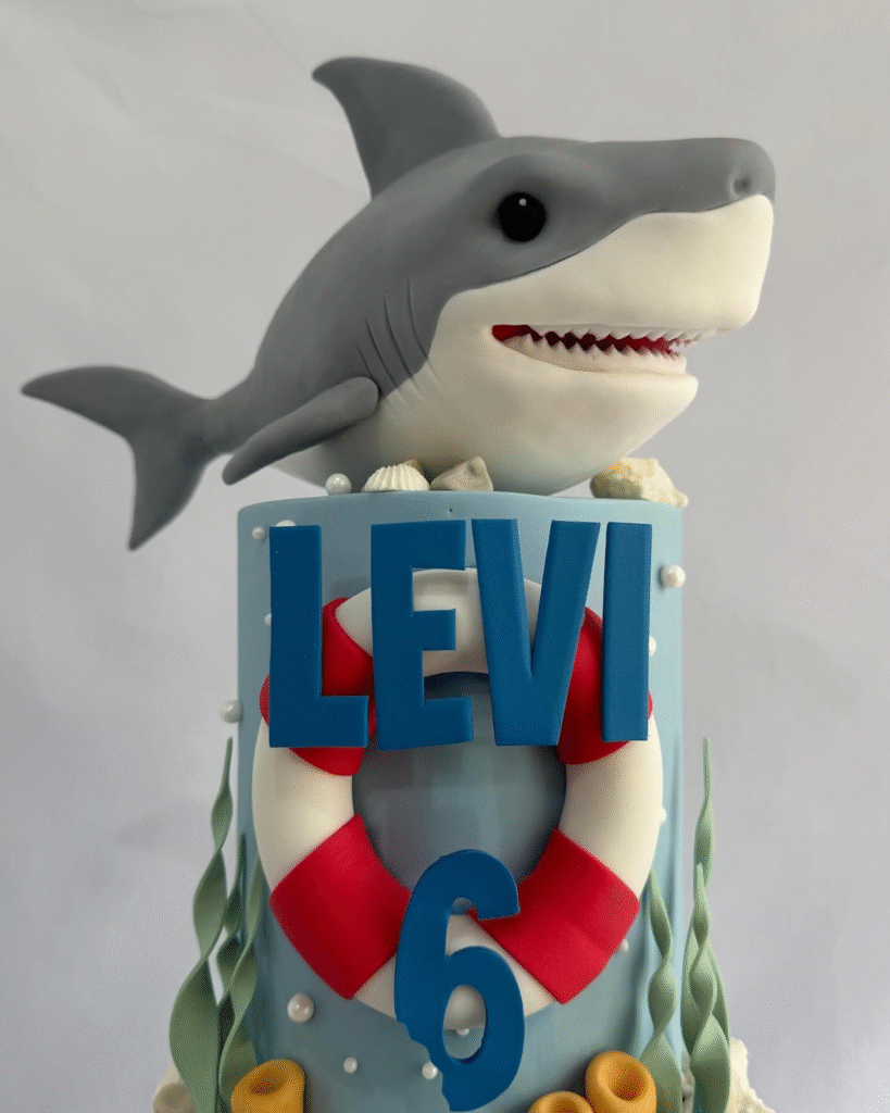 What Makes This Image Stand Out: The bold lifebuoy design, paired with a detailed shark topper, blends nautical charm with playful undersea adventure.