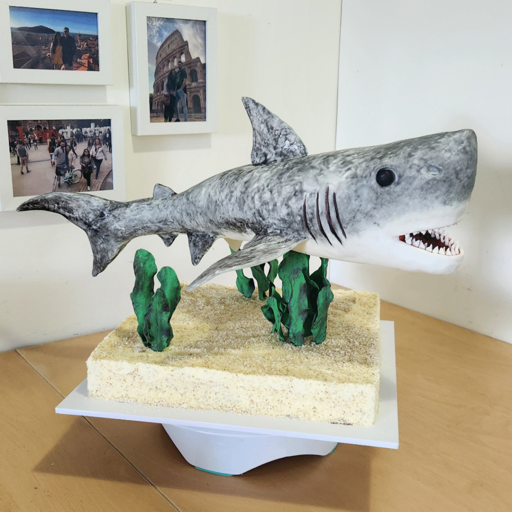 From sharp teeth to the carefully sculpted fins, every detail reflects creativity and precision. The sandy and plant details balance the bold centerpiece, making the cake both dramatic and visually stunning for ocean-themed occasions.