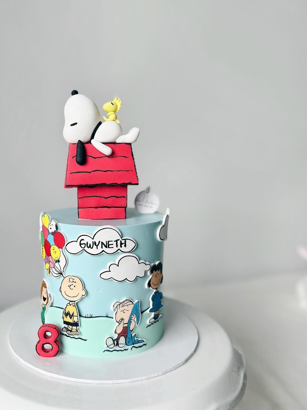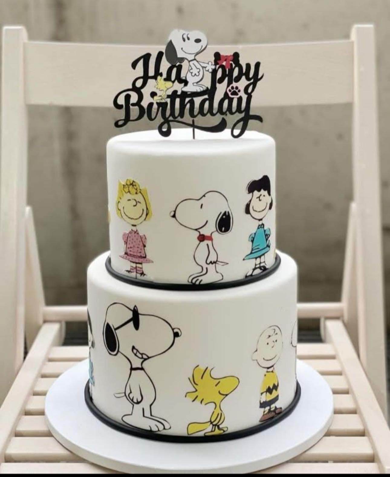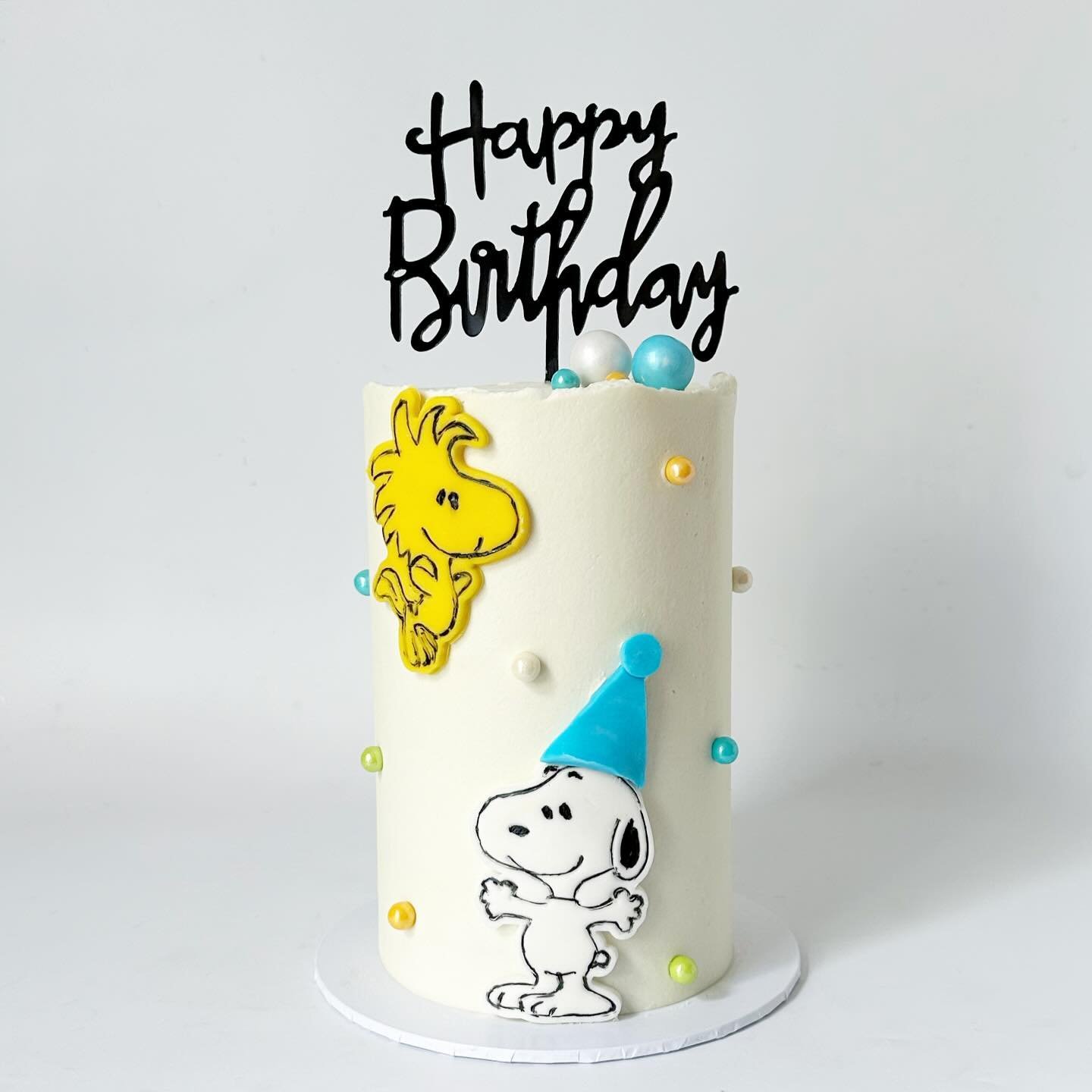 The bold “Happy Birthday” topper featuring Snoopy adds a lively finishing touch. With its balance of simplicity and character-focused design, the cake radiates joy and creativity, making it an ideal centerpiece for a cheerful celebration.