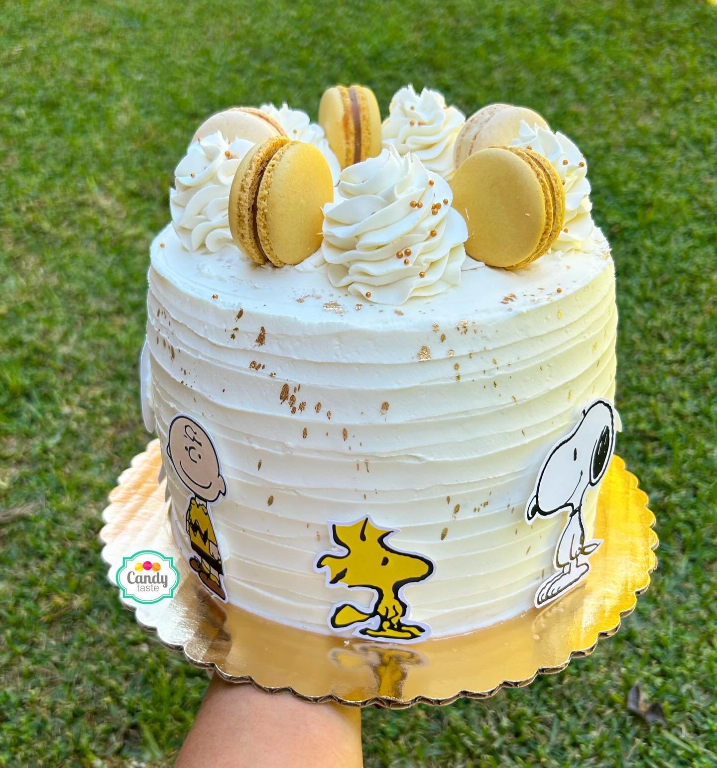 Elegant charm blends with playful touches in this white textured cake decorated with gold-speckled accents. Around the sides, beloved characters like Snoopy, Woodstock, and Charlie Brown bring a whimsical cartoon flair that contrasts beautifully with the refined frosting style.