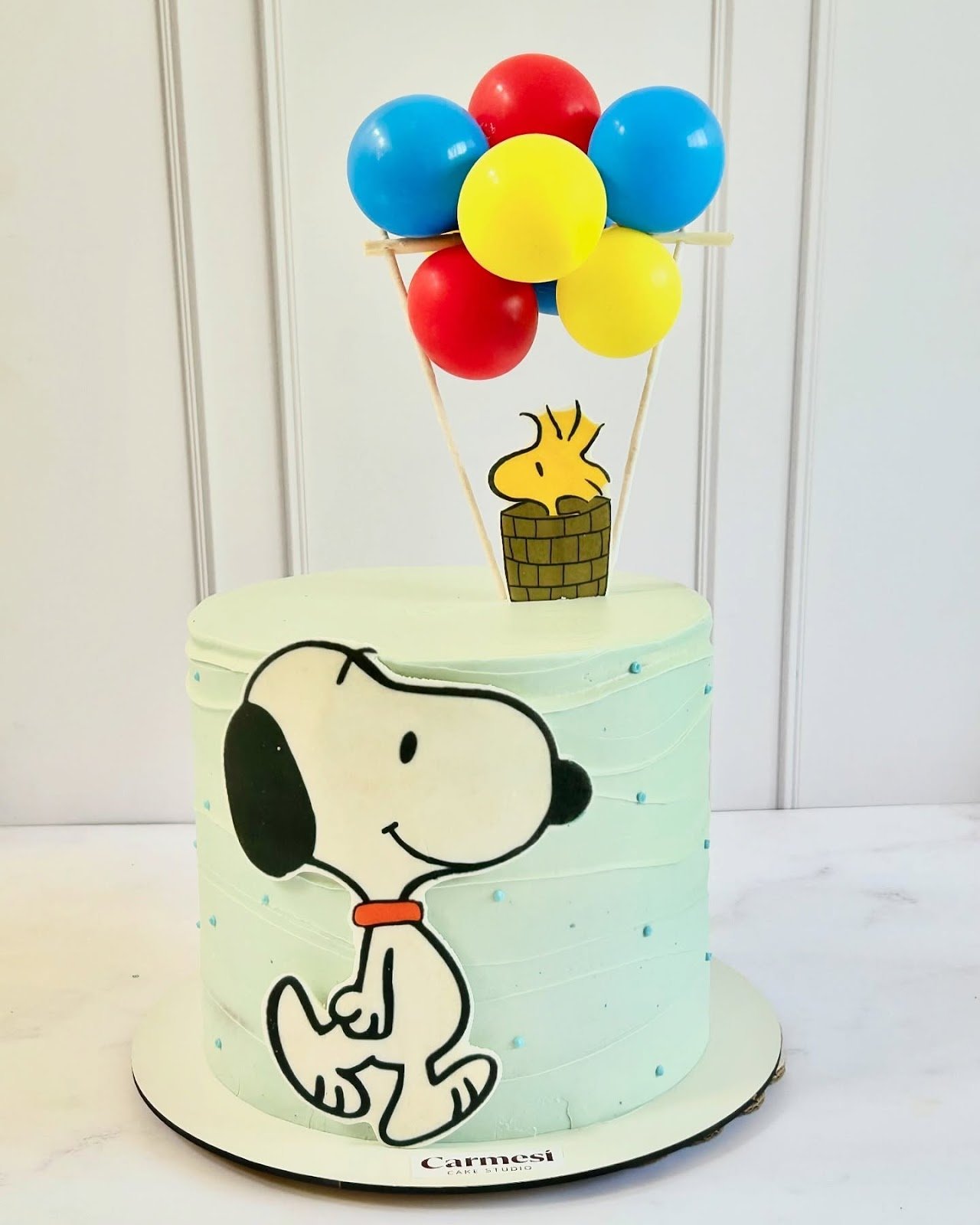 What Makes This Image Stand Out: The creative hot-air balloon topper with Woodstock and bold Snoopy design combines fun storytelling with colorful visual appeal.