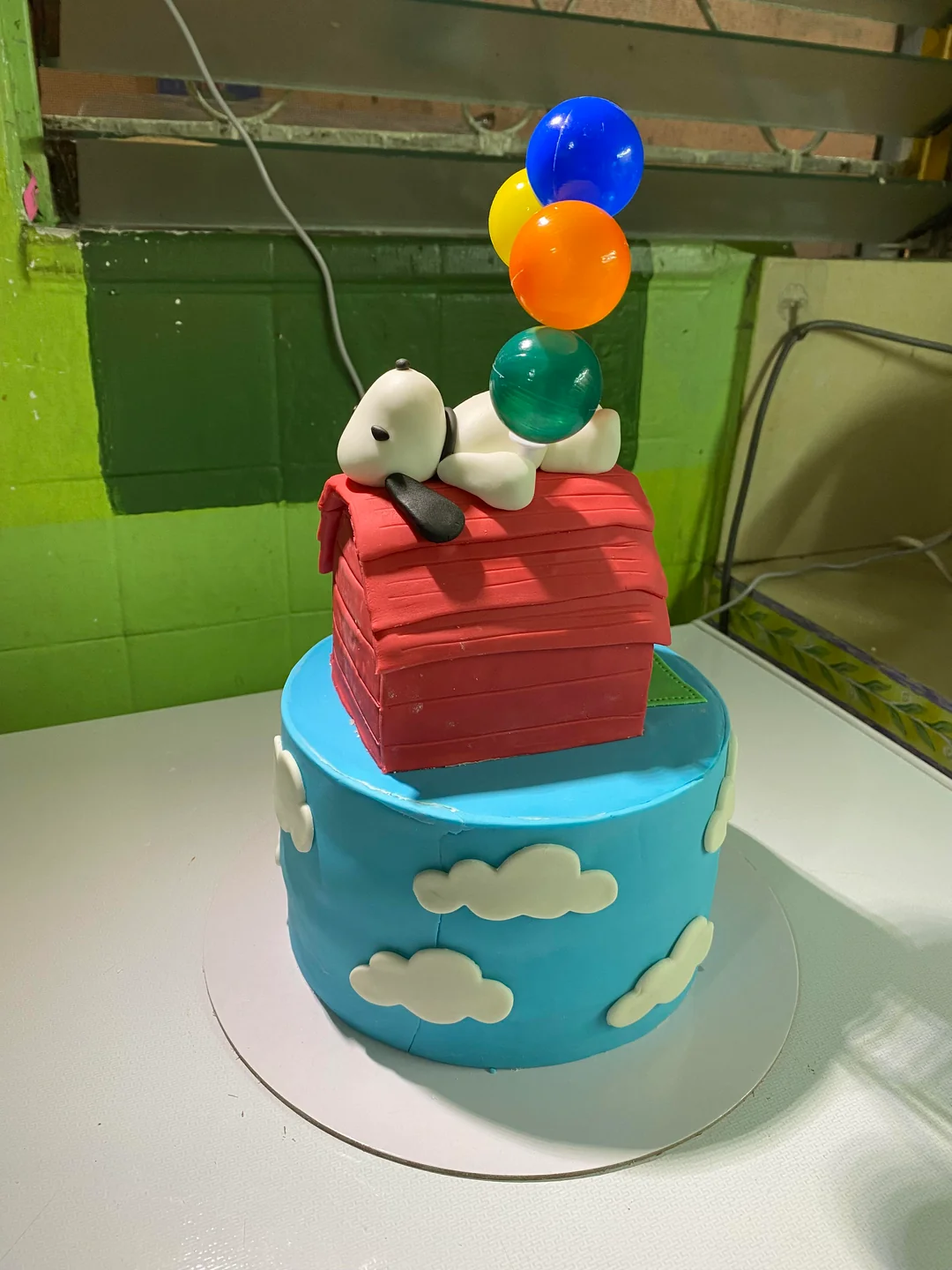 At the top, Snoopy relaxes on his red doghouse with Woodstock perched beside him, creating a playful centerpiece. The combination of colorful character cutouts, balloon details, and a personalized theme makes this cake both fun and meaningful.