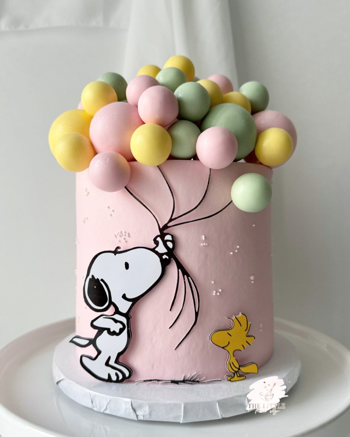 What Makes This Image Stand Out: The pastel balloon cascade paired with Snoopy and Woodstock illustrations creates a dreamy, whimsical cake full of visual delight.