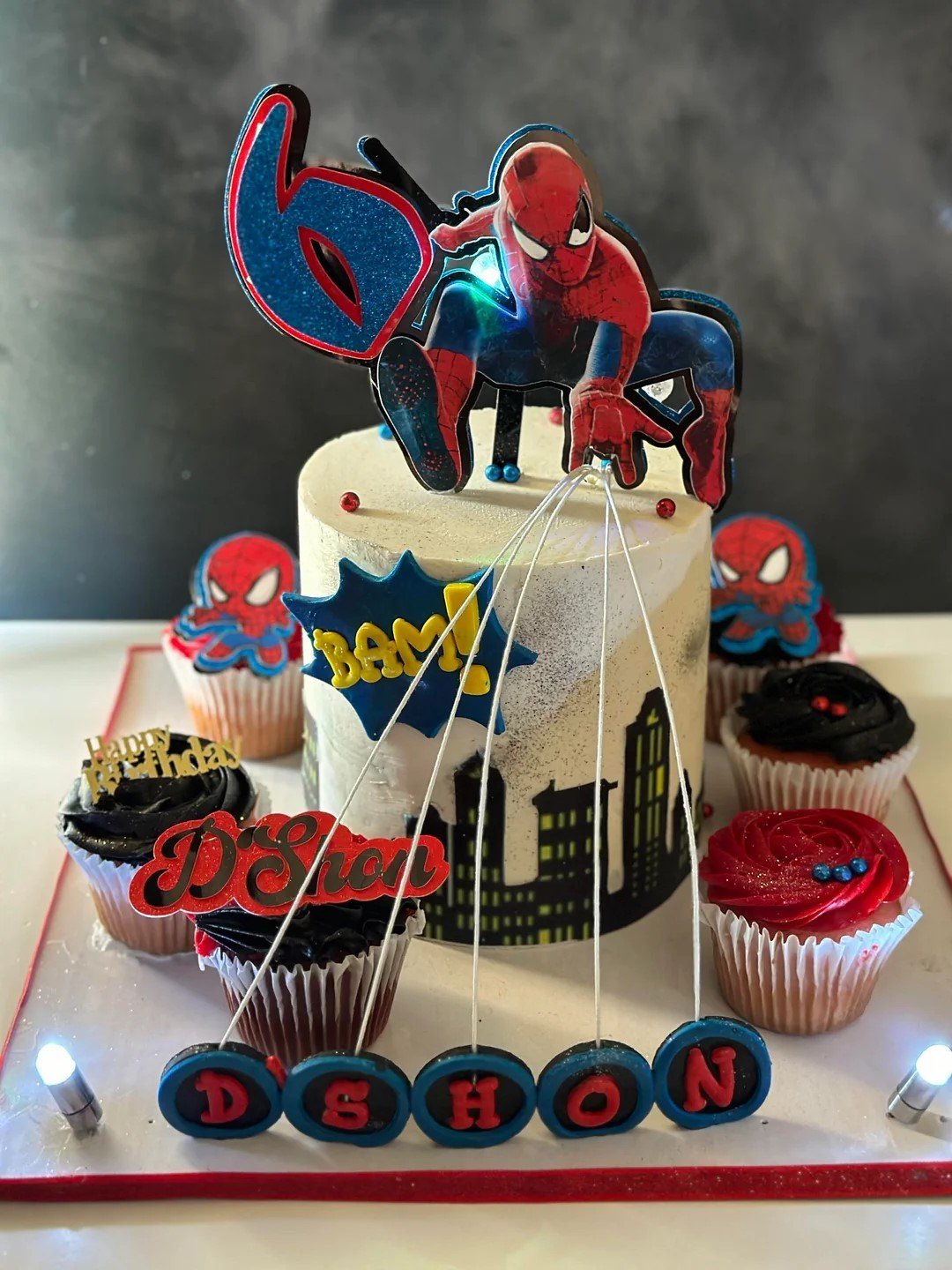 What makes this cake extra special is the attention to detail that ties everything together. The web strings attaching the letters bring Spider-Man’s world right into the celebration, while small comic-style cutouts like “BAM!” add a fun pop-art effect. The glowing lights on the cake board give it a dramatic stage-like presence, turning dessert into the centerpiece of the party. This cake isn’t just about looks, it creates a full superhero experience that both kids and guests will remember. It’s perfect for parents who want a cake that’s bold, interactive, and completely unforgettable.