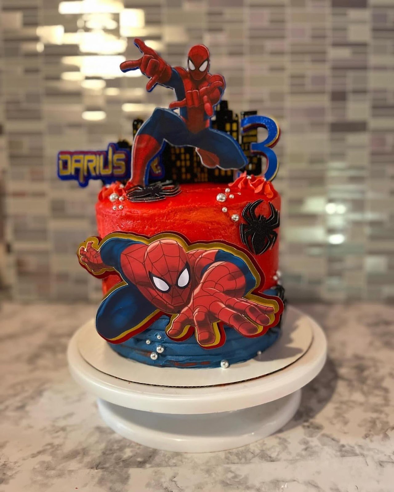 The mix of vibrant red and deep blue frosting gives this cake a strong comic-book vibe, while the small black spider details tie everything together. The custom name topper makes it feel personal and memorable for the birthday child. Not only does this cake deliver on style, but it also brings that superhero thrill that kids love so much. Perfect for a third birthday, this design is both playful and powerful, capturing the magic of Spider-Man’s world in a cake that feels straight out of the comics.