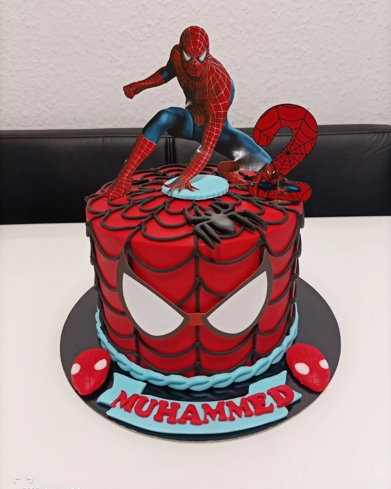 Spider-Man cake is a true showstopper for any Spider-Man fan. The bold red fondant base covered in black web patterns makes it instantly recognizable as Spidey-inspired. The striking white eyes at the front give the cake that classic Spider-Man mask look, while the large 3D topper of Spider-Man crouching in action brings a sense of energy and excitement. The number “2” alongside the topper makes it perfect for a second birthday, and the detailed spider on top ties the whole theme together. The name plate at the bottom adds a personal touch that makes the cake extra special.