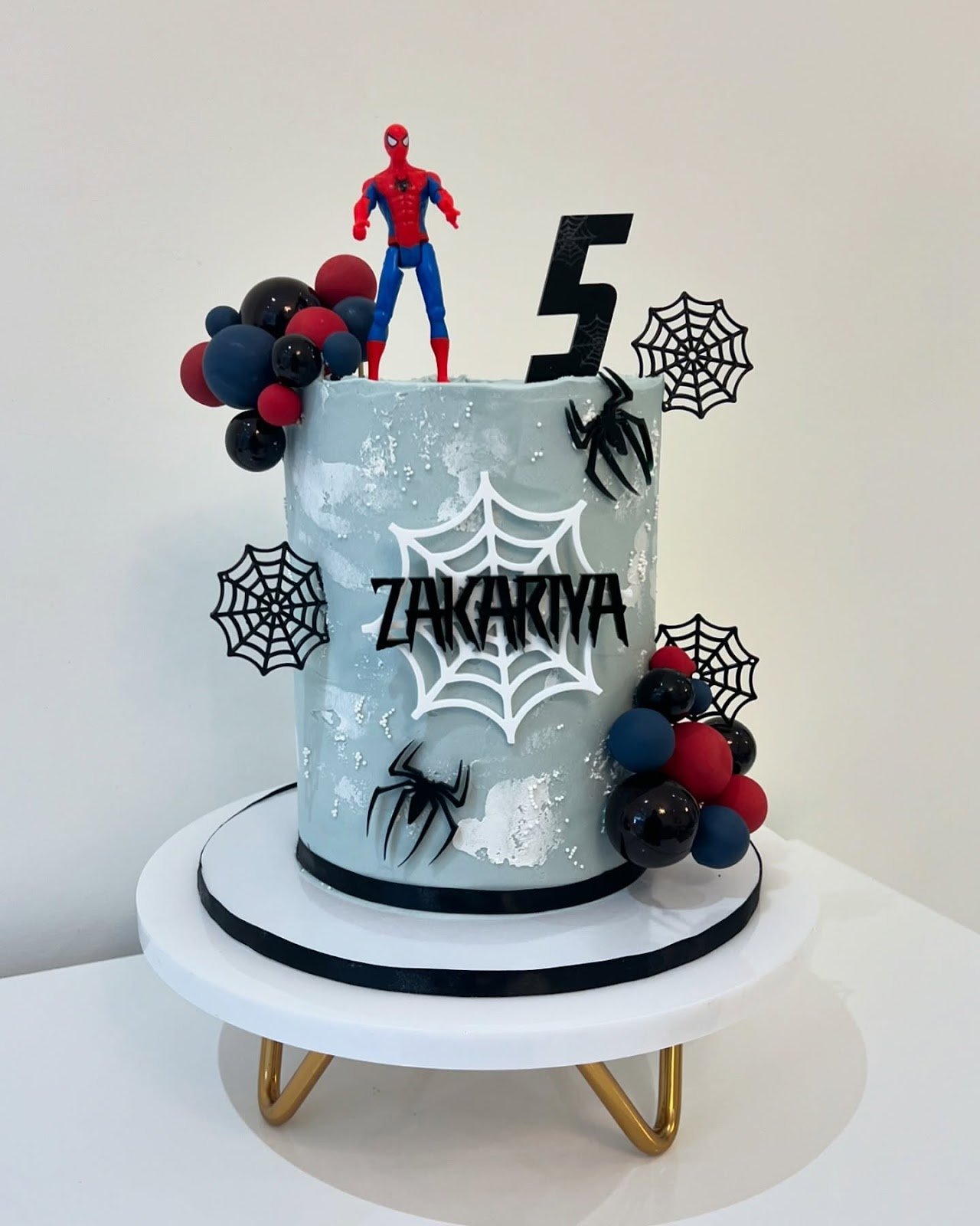 The above cake takes Spider-Man design to a modern, stylish level. Instead of bold, bright patterns, it uses a smooth gray background with metallic silver accents that give it a sleek look. The web designs and spider cutouts add that signature Spidey touch without overpowering the cake’s minimal aesthetic. On top, a Spider-Man figure stands proudly next to a bold black number “5,” making it perfect for celebrating a fifth birthday in superhero style. The cluster of black, blue, and red spheres adds a fun pop of color while keeping the design clean and balanced.