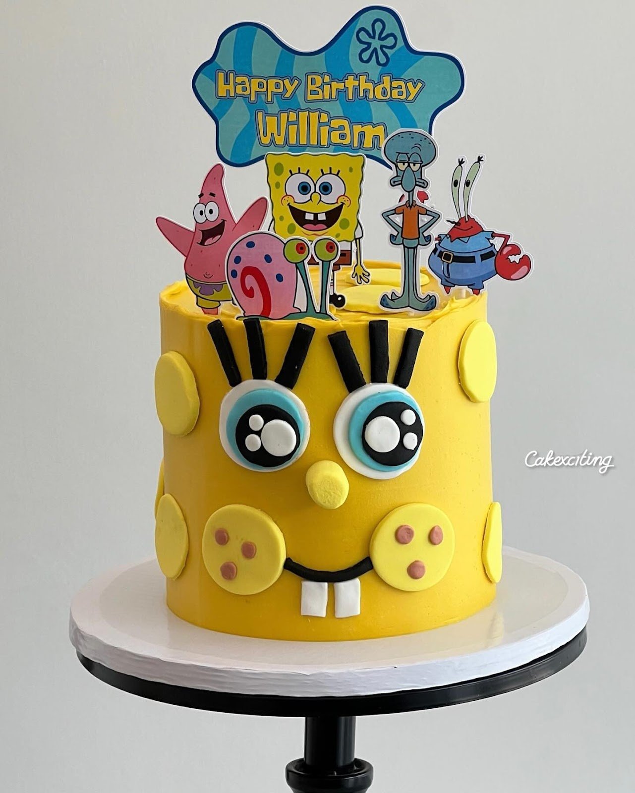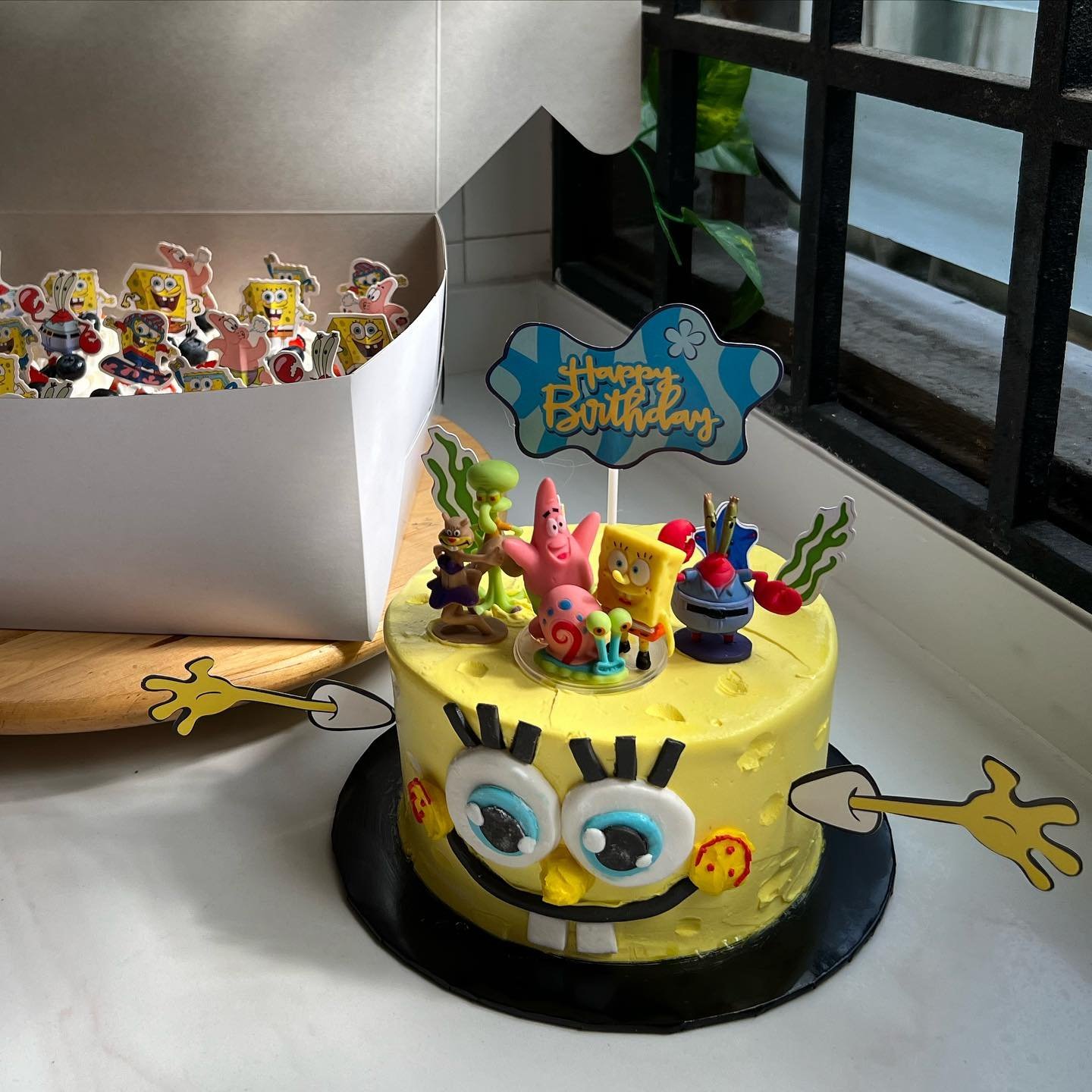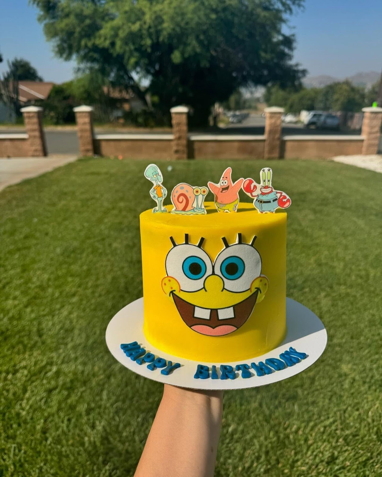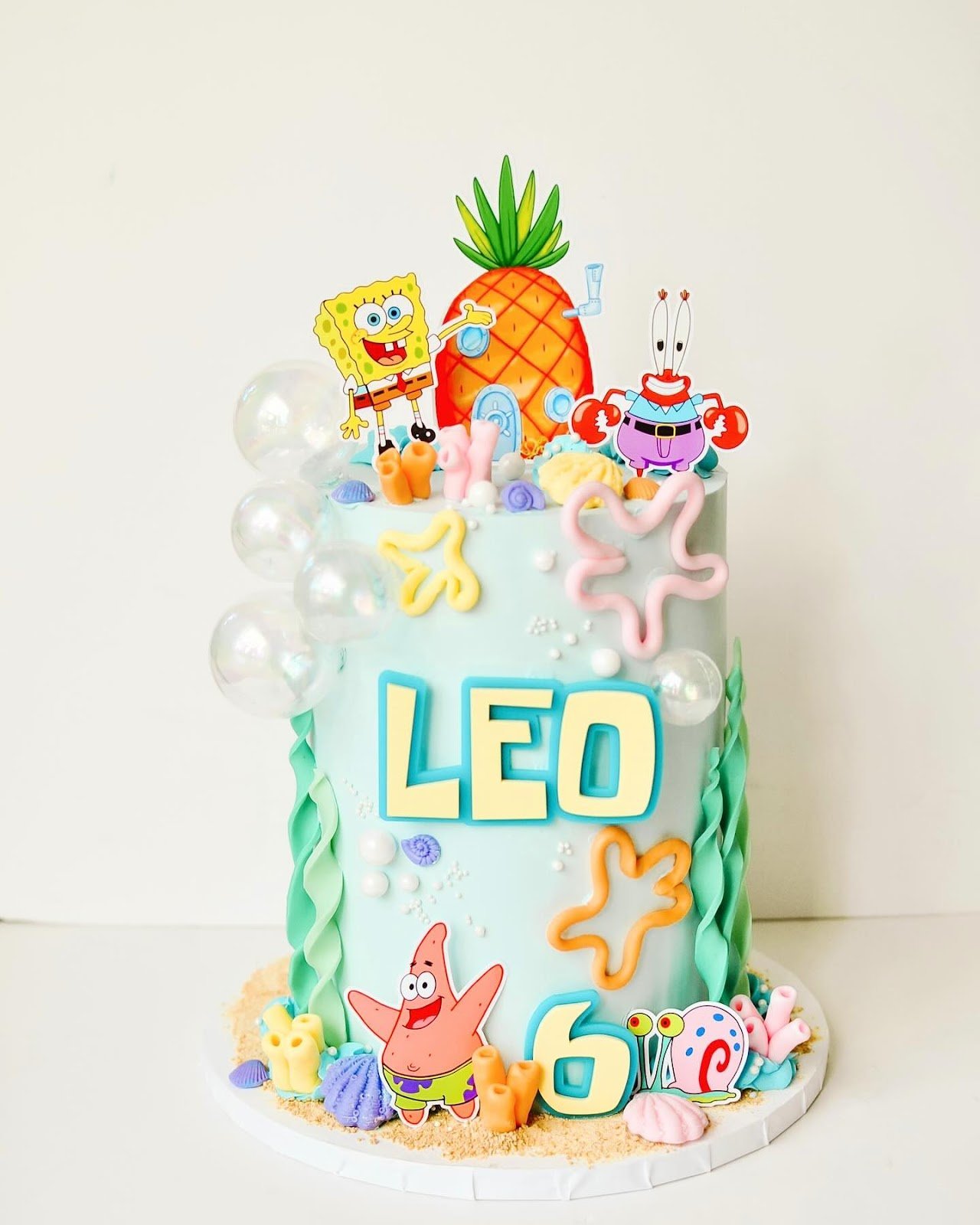 Cutout toppers of Patrick, Squidward, Gary, and Mr. Krabs add extra character charm, making the cake feel like a true Bikini Bottom party. Clean, minimal design paired with vibrant details ensures the cake stands out in any celebration.