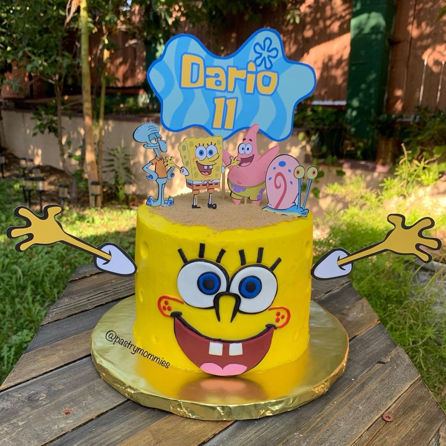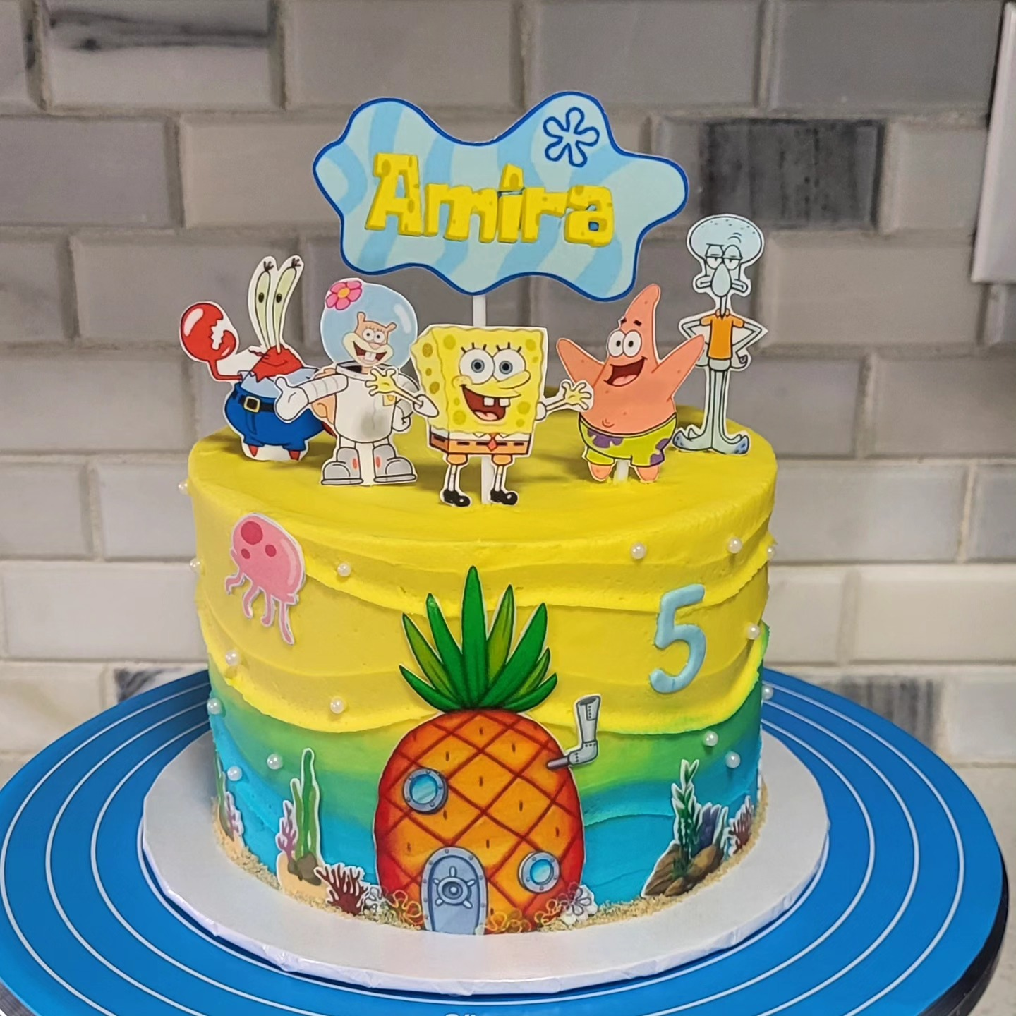 Topped with SpongeBob, Patrick, Sandy, Squidward, and Mr. Krabs cutouts, the cake captures the full energy of the show’s beloved characters. Personalized with a name topper and bright number “5,” it makes an exciting centerpiece for young fans.