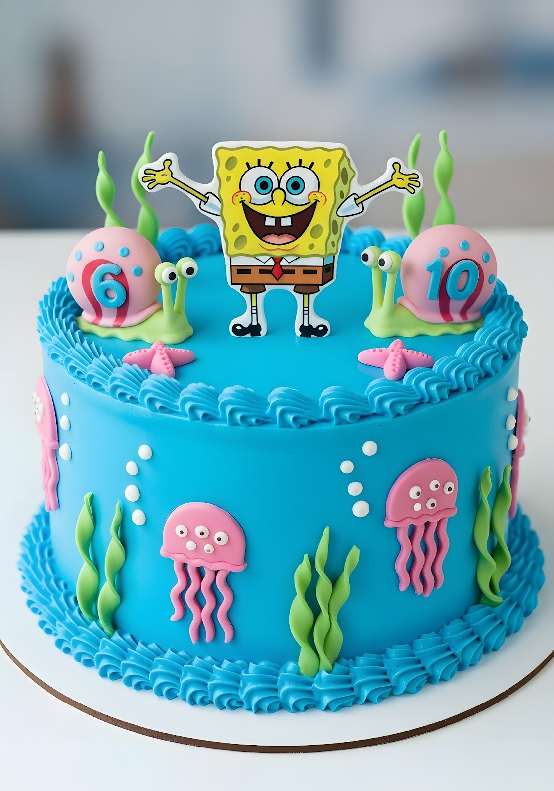 A bright blue base with wavy piped frosting sets the underwater stage for SpongeBob’s cheerful presence. Pink fondant jellyfish, green seaweed, and bubbly accents surround the sides, capturing the playful and lively atmosphere of Bikini Bottom’s jellyfish fields.