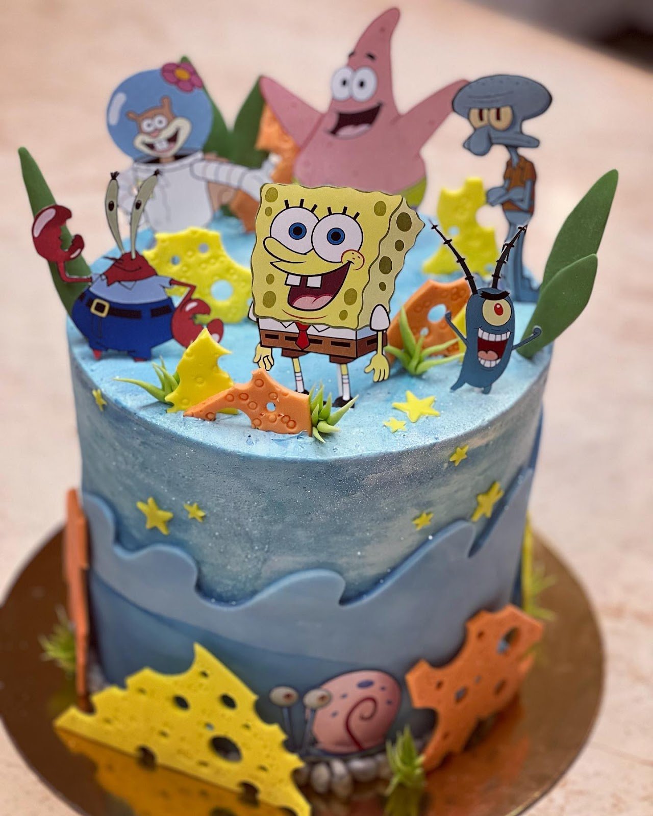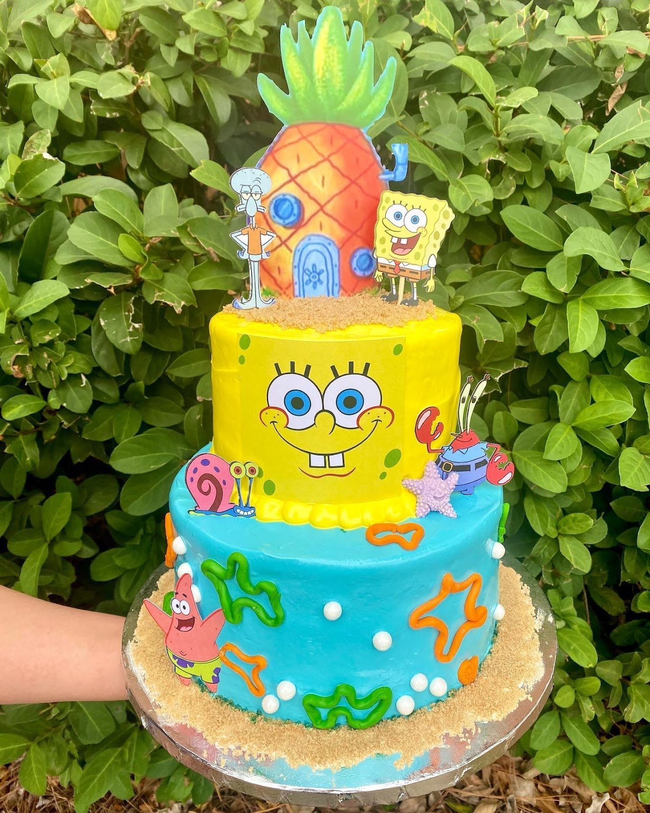 Topped with Bikini Bottom’s pineapple house, Gary, and Sandy, alongside Patrick and Squidward at the base, the cake feels alive with undersea adventure. Crushed cookie sand, mini pineapples, and green seaweed details add the final touch of creativity.