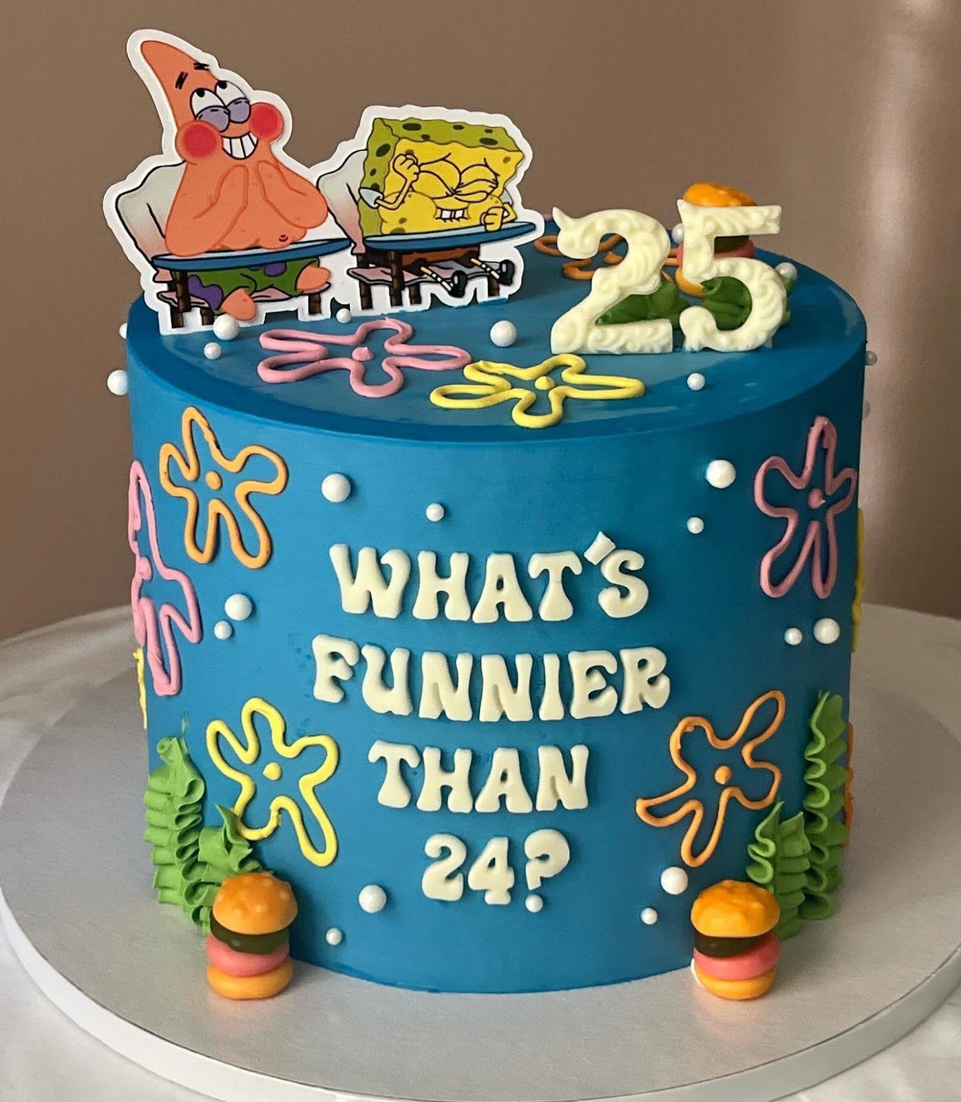 Topped with playful cutouts of SpongeBob and Patrick laughing together, along with bold number “25” candles, the cake celebrates humor and milestones in style. Tiny fondant Krabby Patties and seaweed details complete the theme, adding a fun finishing touch.