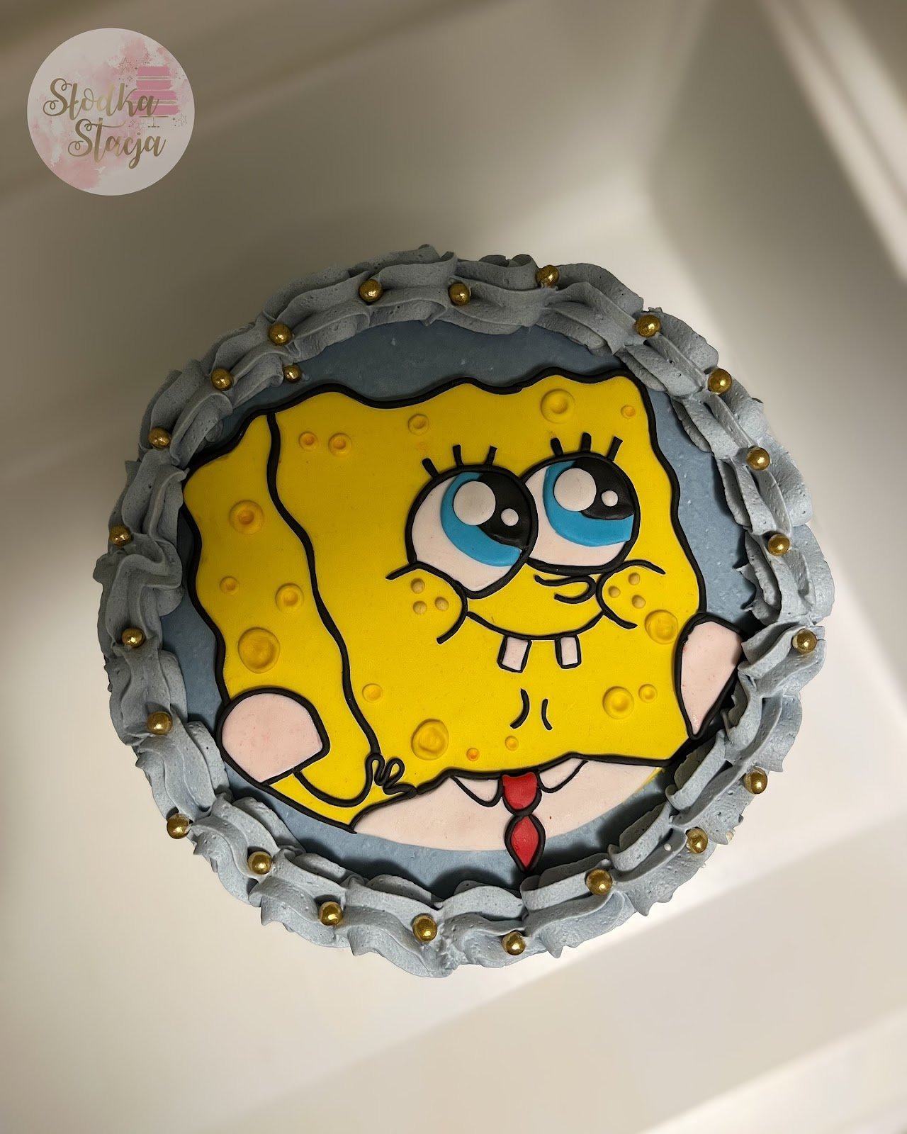 A border of grey swirled frosting dotted with golden pearls frames the cake, adding elegance to the fun theme. The balance of character charm and decorative accents creates a design that feels both whimsical and celebratory for any SpongeBob fan.