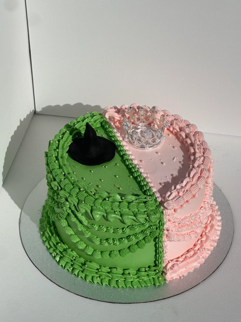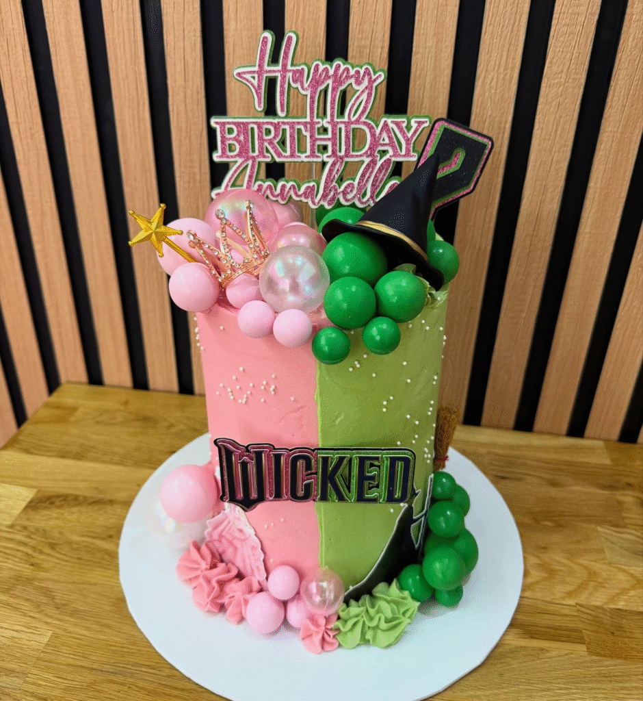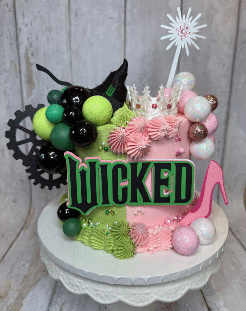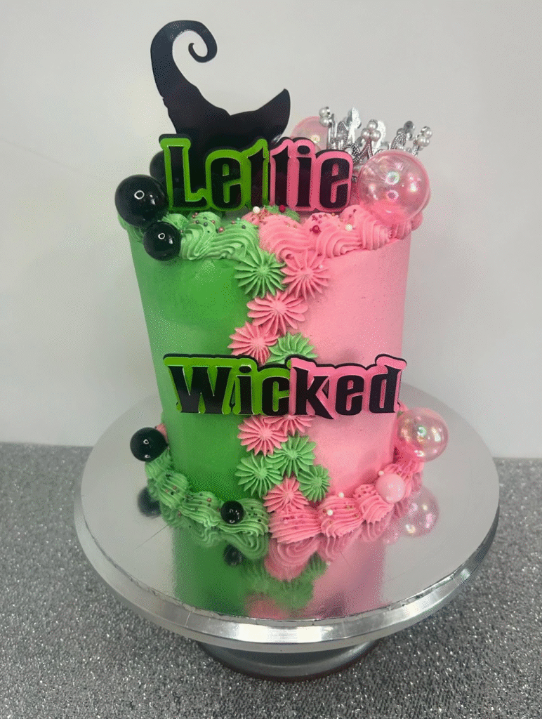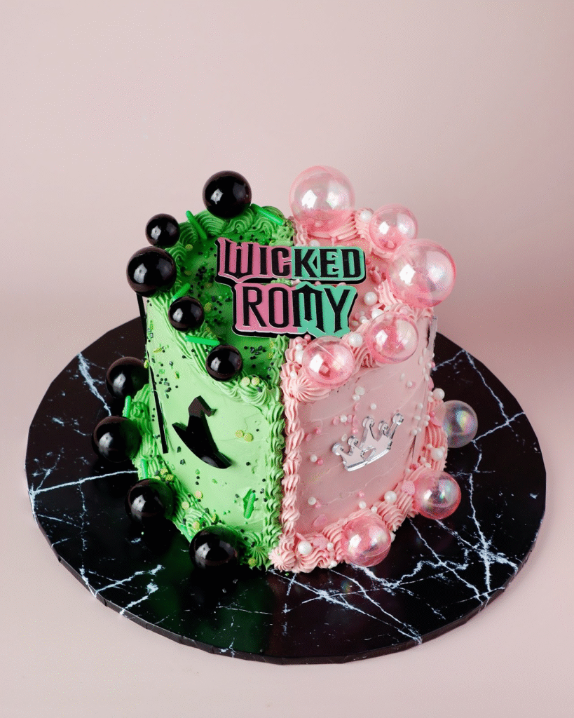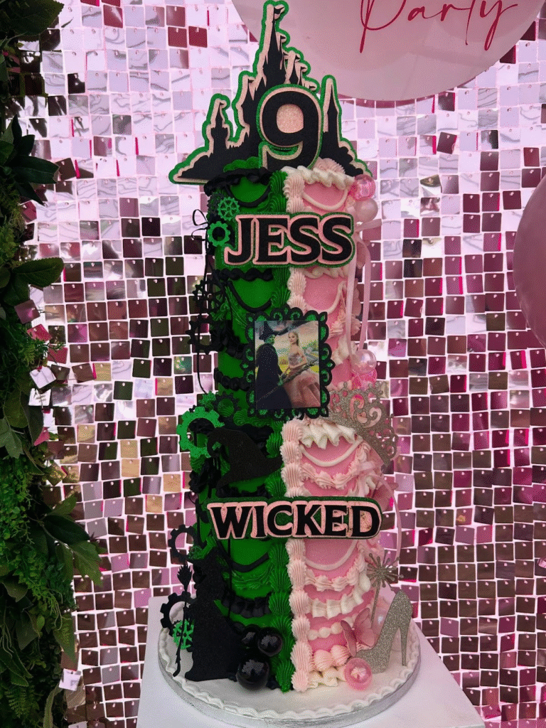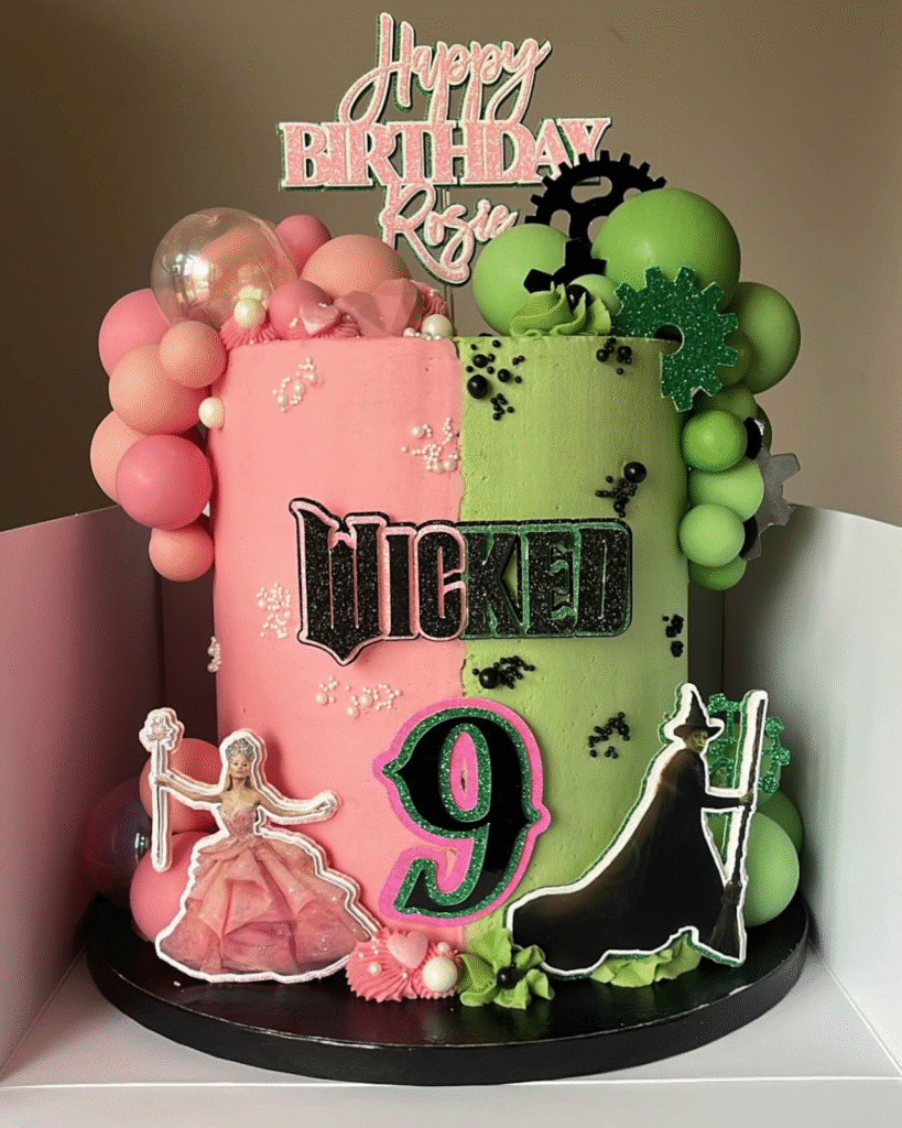 This vibrant birthday cake is a striking blend of pink and green, perfectly capturing the essence of a “Wicked” theme. On one side, the cake is adorned with soft pink frosting, while the other features bold green accents, creating a fun and dramatic contrast.