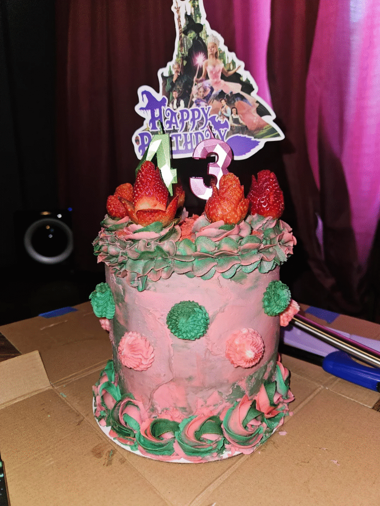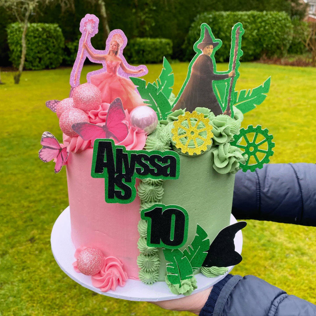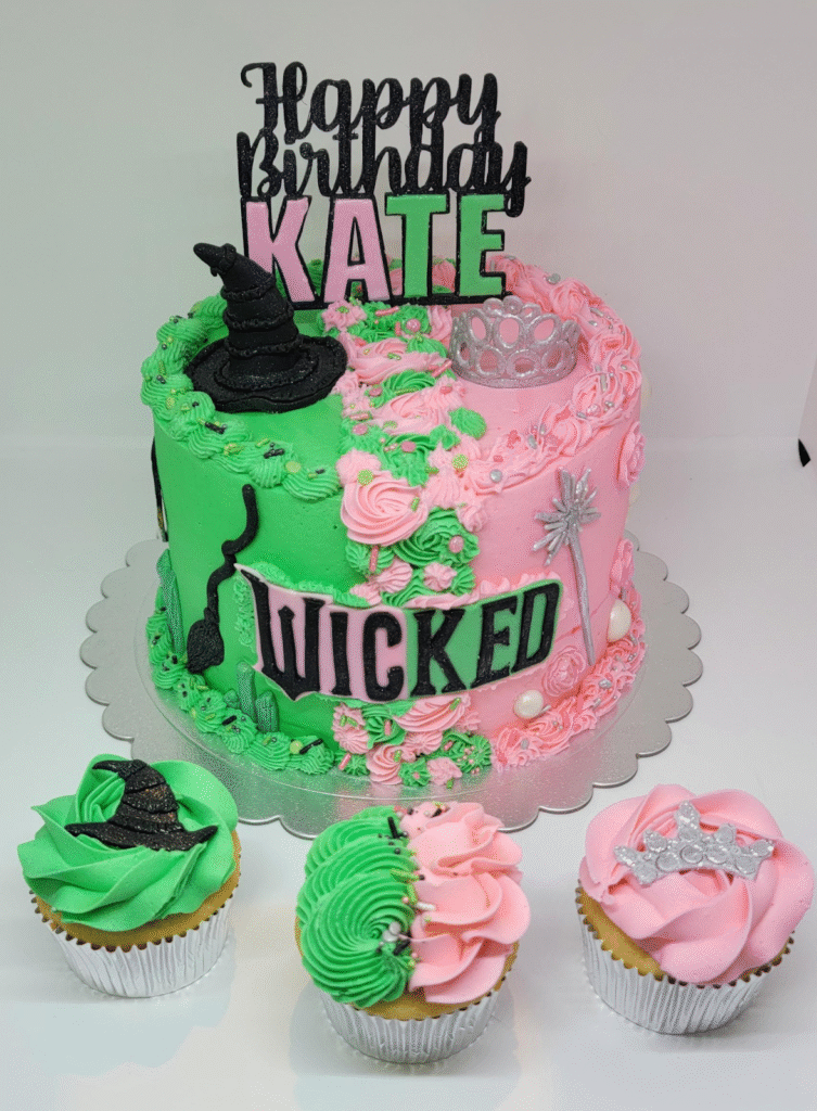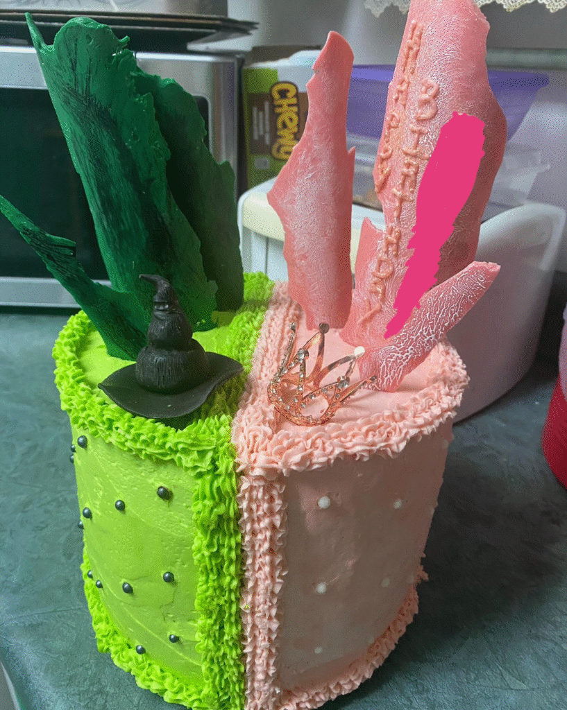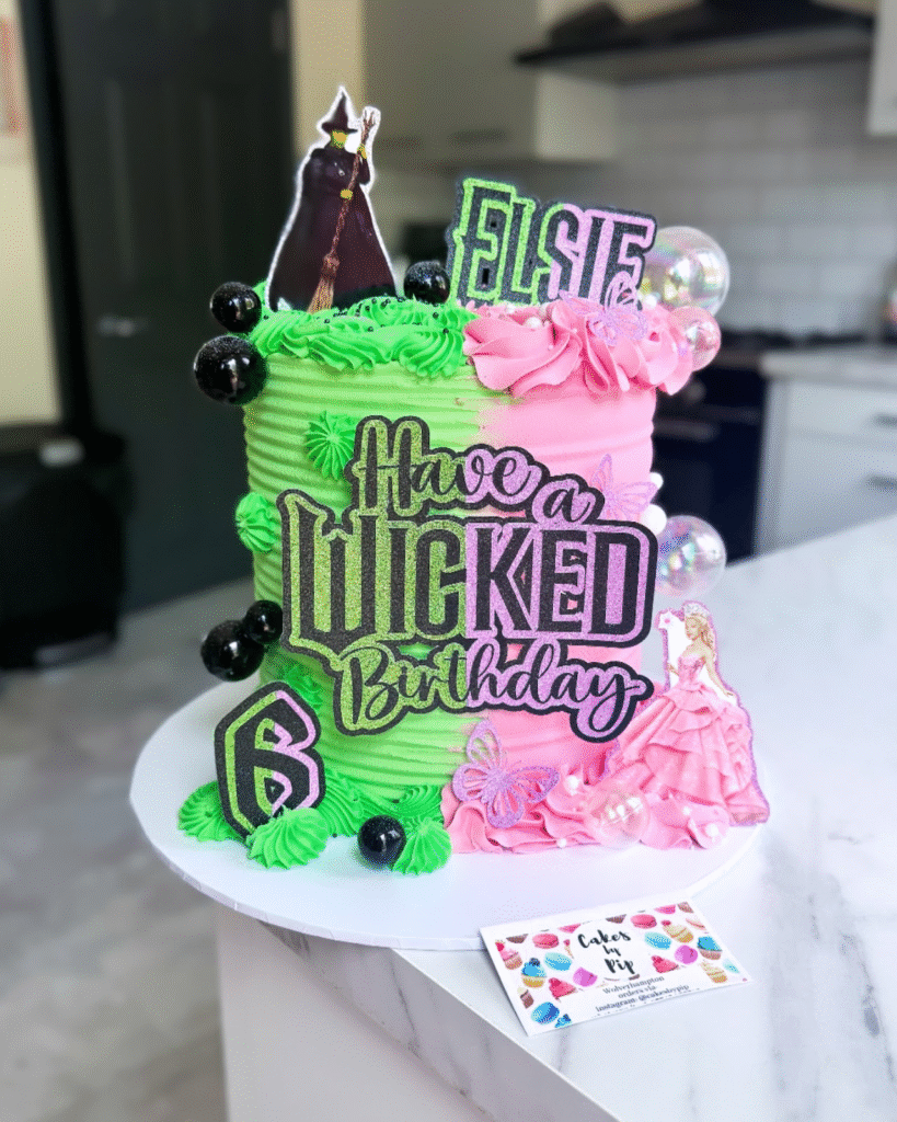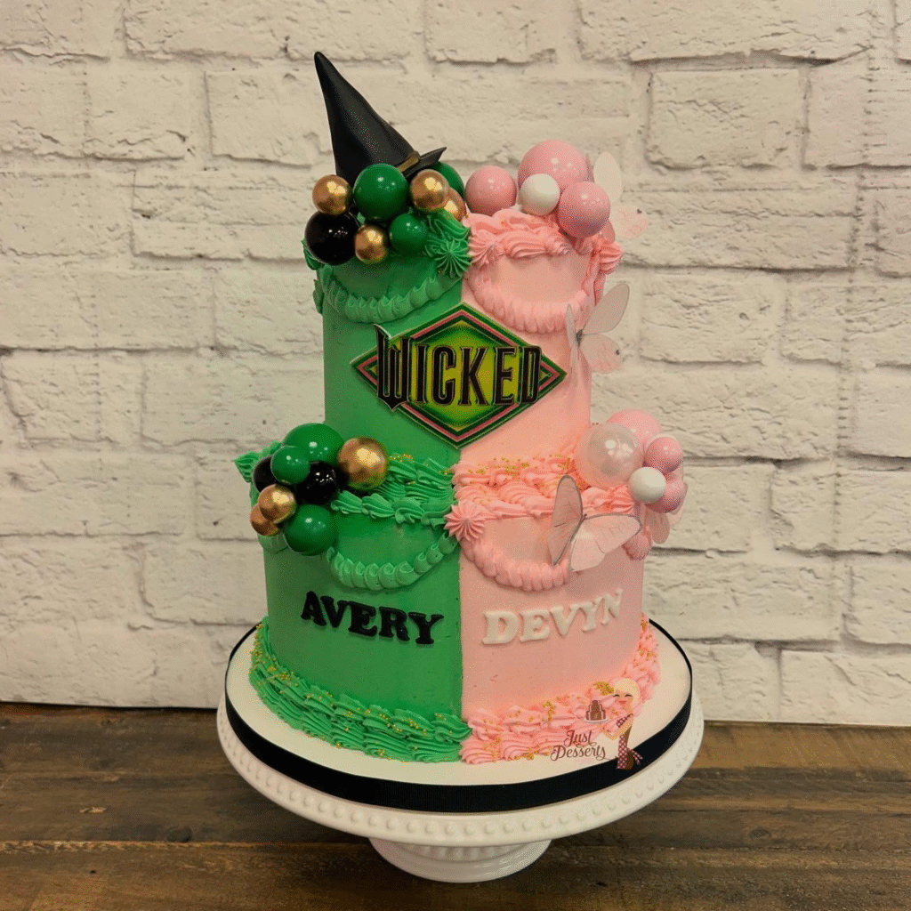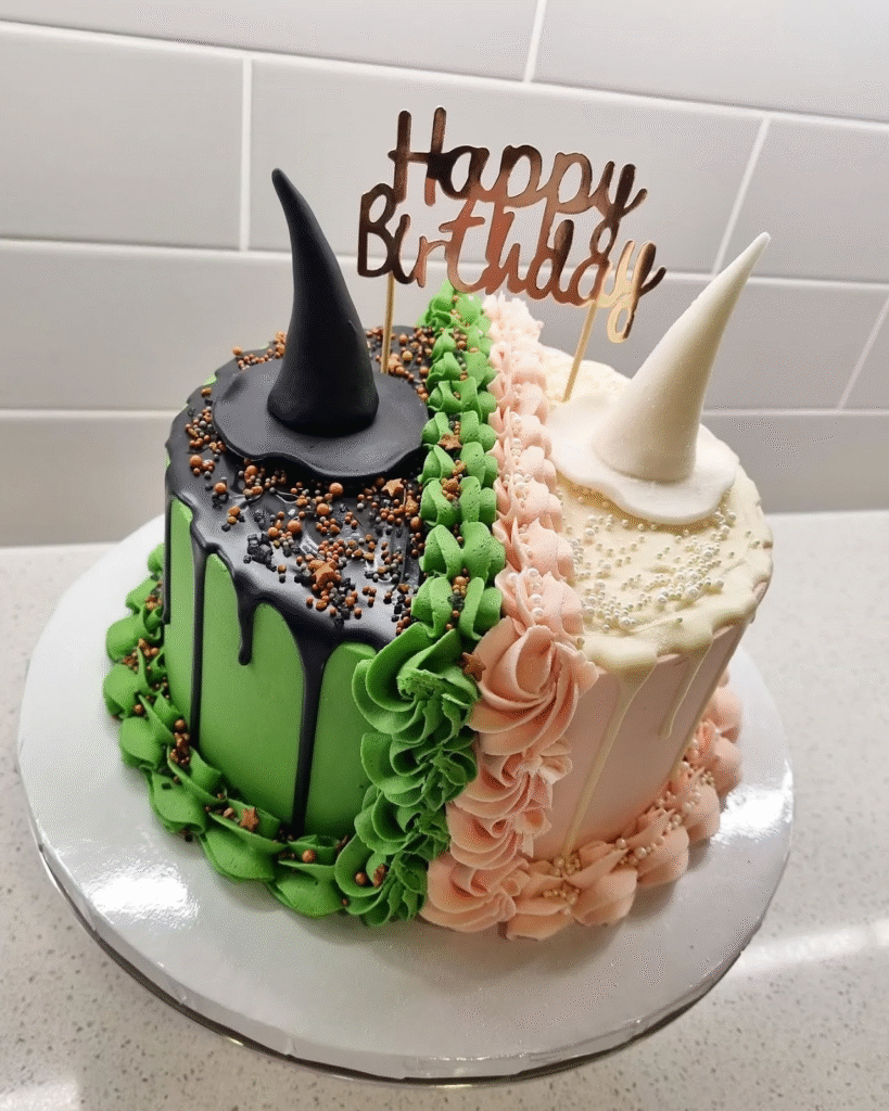 This vibrant birthday cake is a striking blend of pink and green, perfectly capturing the essence of a “Wicked” theme. On one side, the cake is adorned with soft pink frosting, while the other features bold green accents, creating a fun and dramatic contrast.