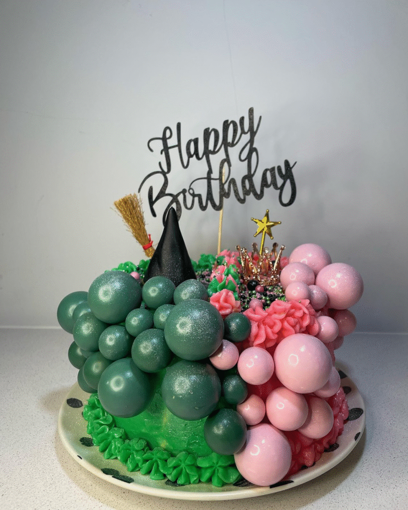 This stunning birthday cake brings a whimsical touch to any celebration. The combination of vibrant green and pink frosting adds a playful contrast, while the “Wicked Birthday” topper, paired with a magical witch figure, gives a fun, mystical vibe.