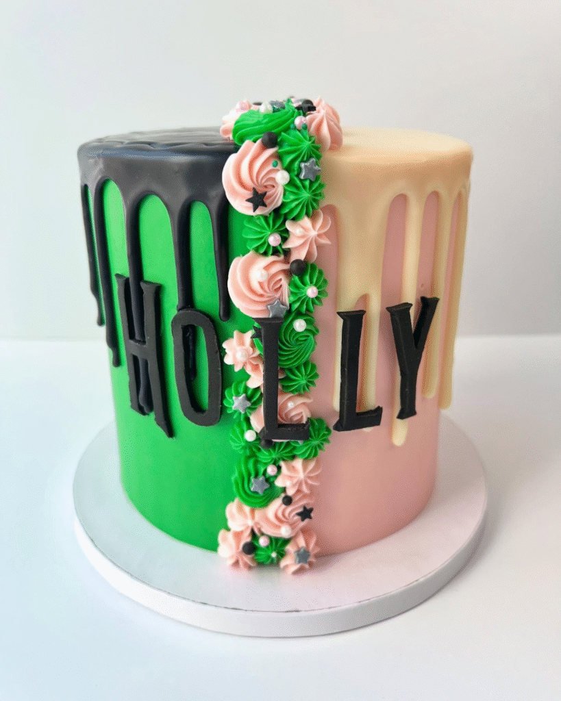 This vibrant cake features a unique two-tone design with striking green and pink drips that catch the eye immediately. The bold black lettering spells out “HOLLY,” bringing a modern touch to the playful vibe.
