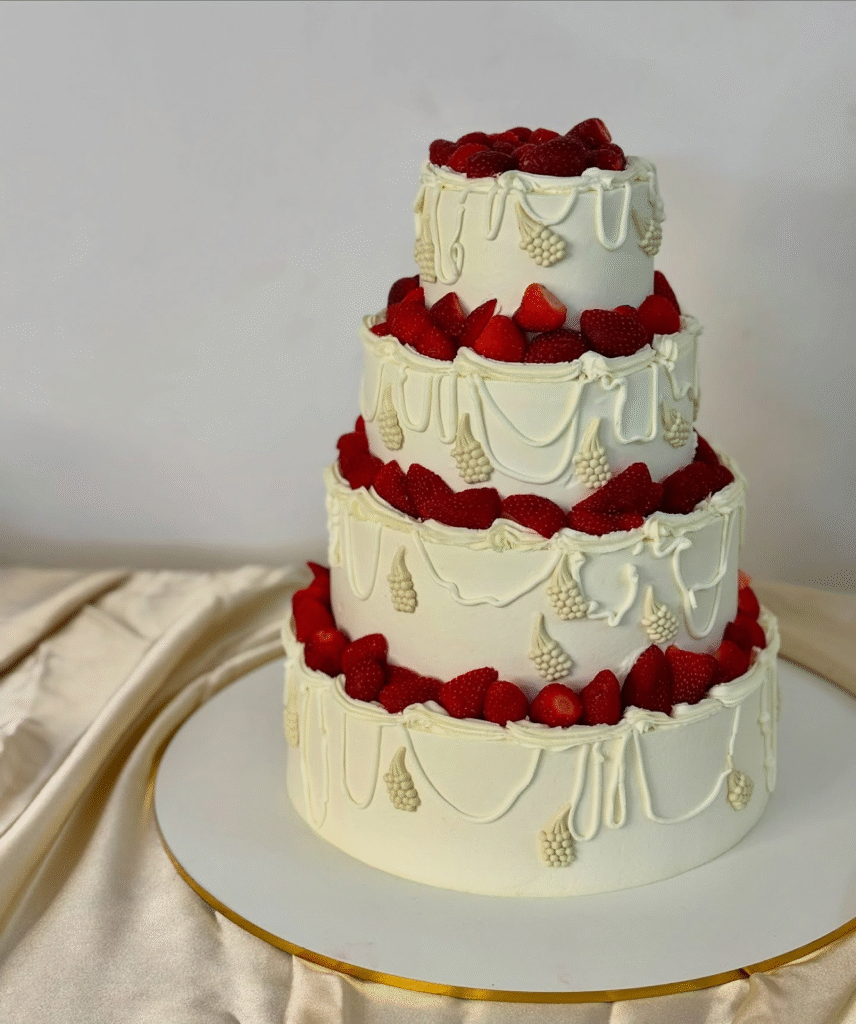 The smooth white finish, accented with strawberries, balances minimalism and luxury beautifully. The multi-tiered design makes it perfect for milestone birthdays, weddings, or any celebration requiring a showstopper dessert.