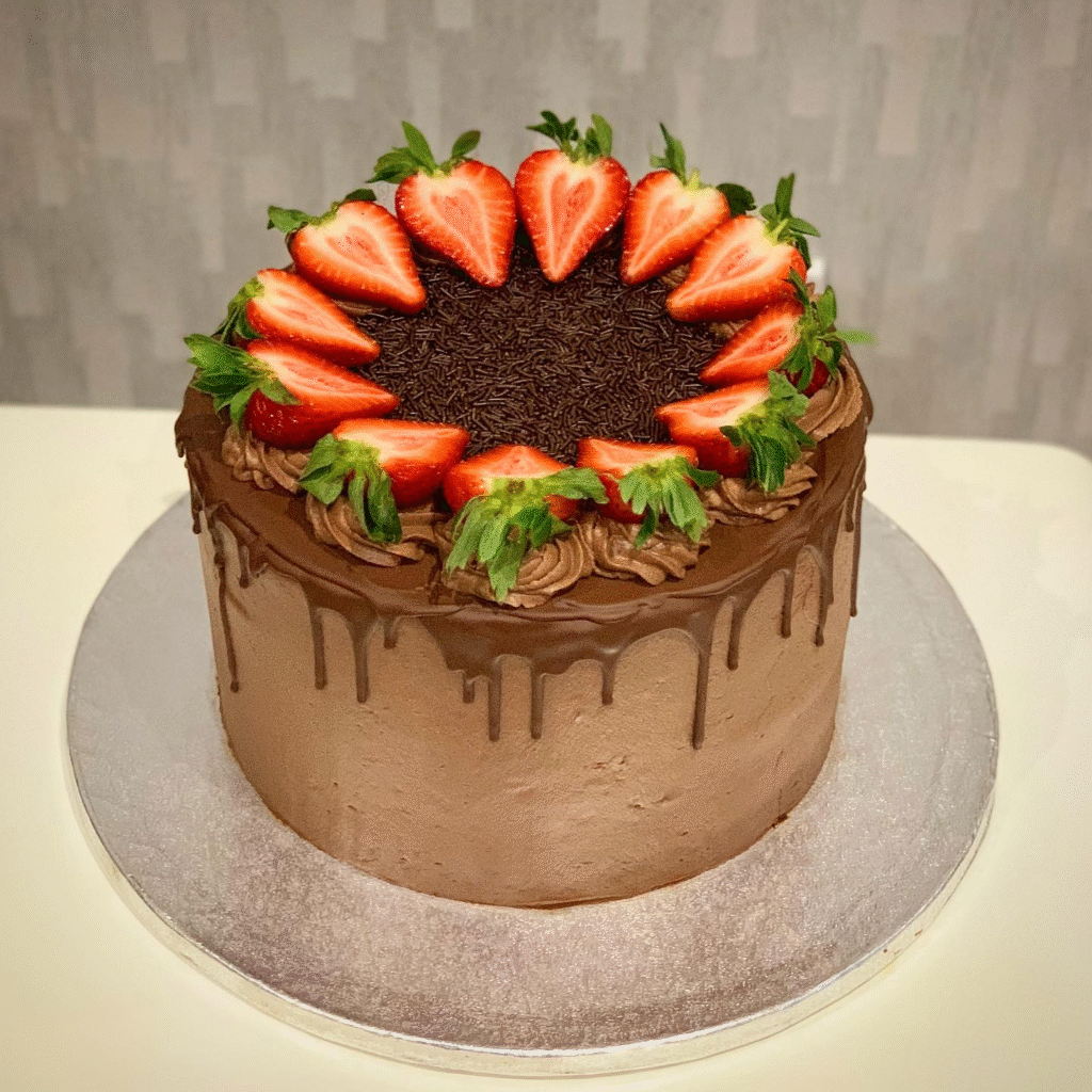 The fresh strawberries provide a burst of color and freshness, complementing the rich chocolate perfectly. The drip effect adds a playful touch, making this cake an indulgent and visually striking centerpiece.