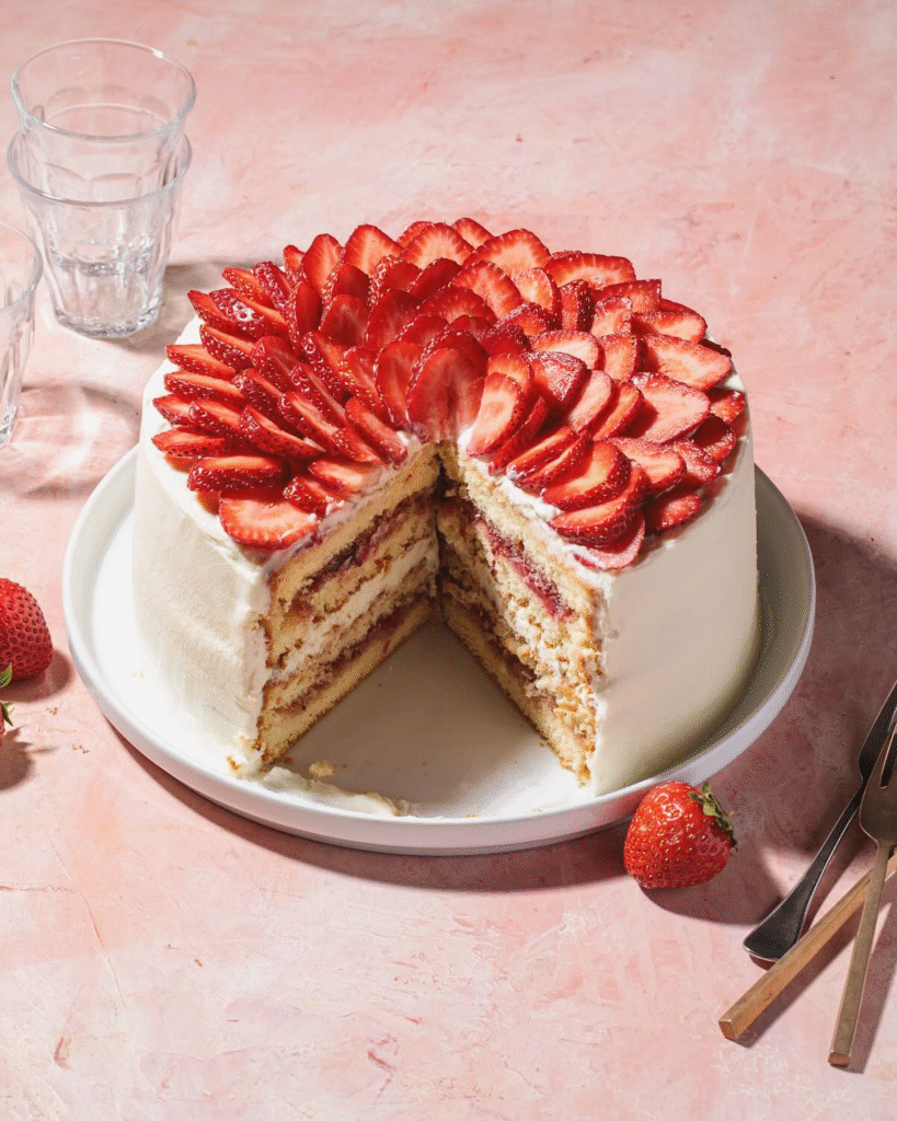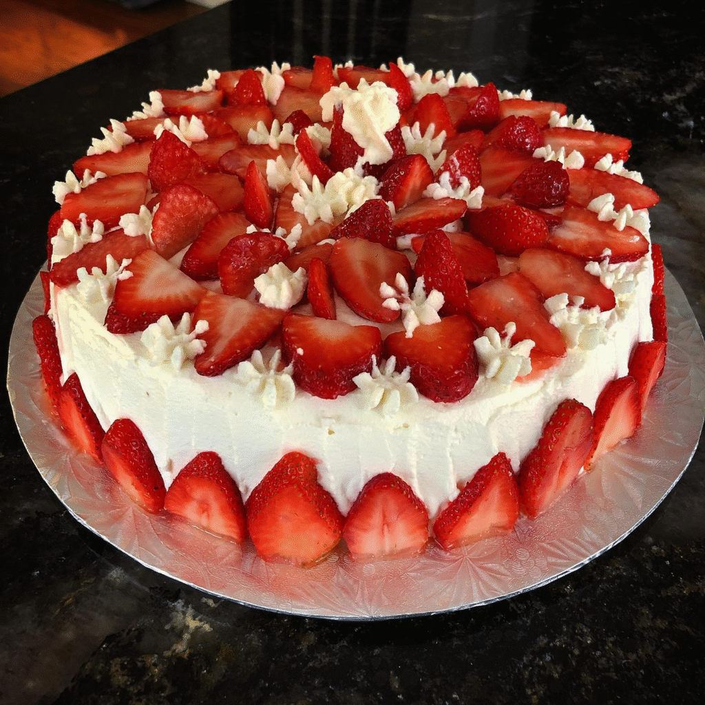 The striking visual of the strawberries, along with the fluffy layers, creates a fresh, inviting appearance. Perfect for spring or summer celebrations, this cake is a light yet indulgent option that combines natural sweetness with creamy goodness.