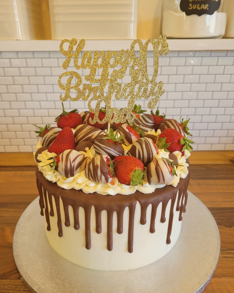 This indulgent birthday cake is adorned with chocolate-covered strawberries, whipped cream rosettes, and a striking gold “Happy 80th Birthday Dad” topper. The rich chocolate drip and creamy frosting combine to create an elegant and delicious centerpiece for the celebration.
