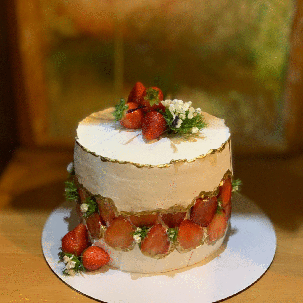 This stunning cake features a smooth layer of cream, decorated with fresh strawberries and delicate white flowers. The gold accents around the base add a touch of elegance, making it perfect for a sophisticated celebration.