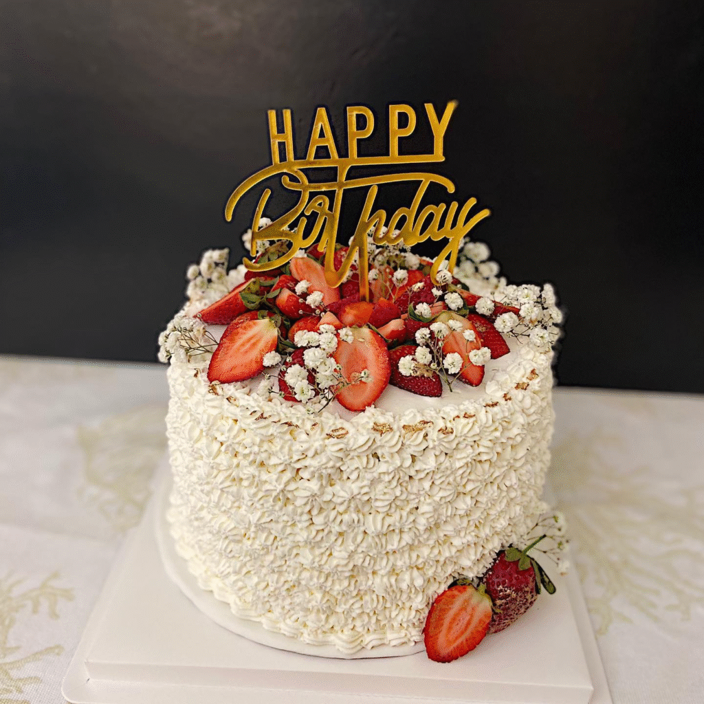 This beautifully designed cake features soft, whipped cream frosting with intricate piping, topped with fresh strawberries and dainty baby’s breath flowers. The “Happy Birthday” topper in gold adds a personal, celebratory touch.