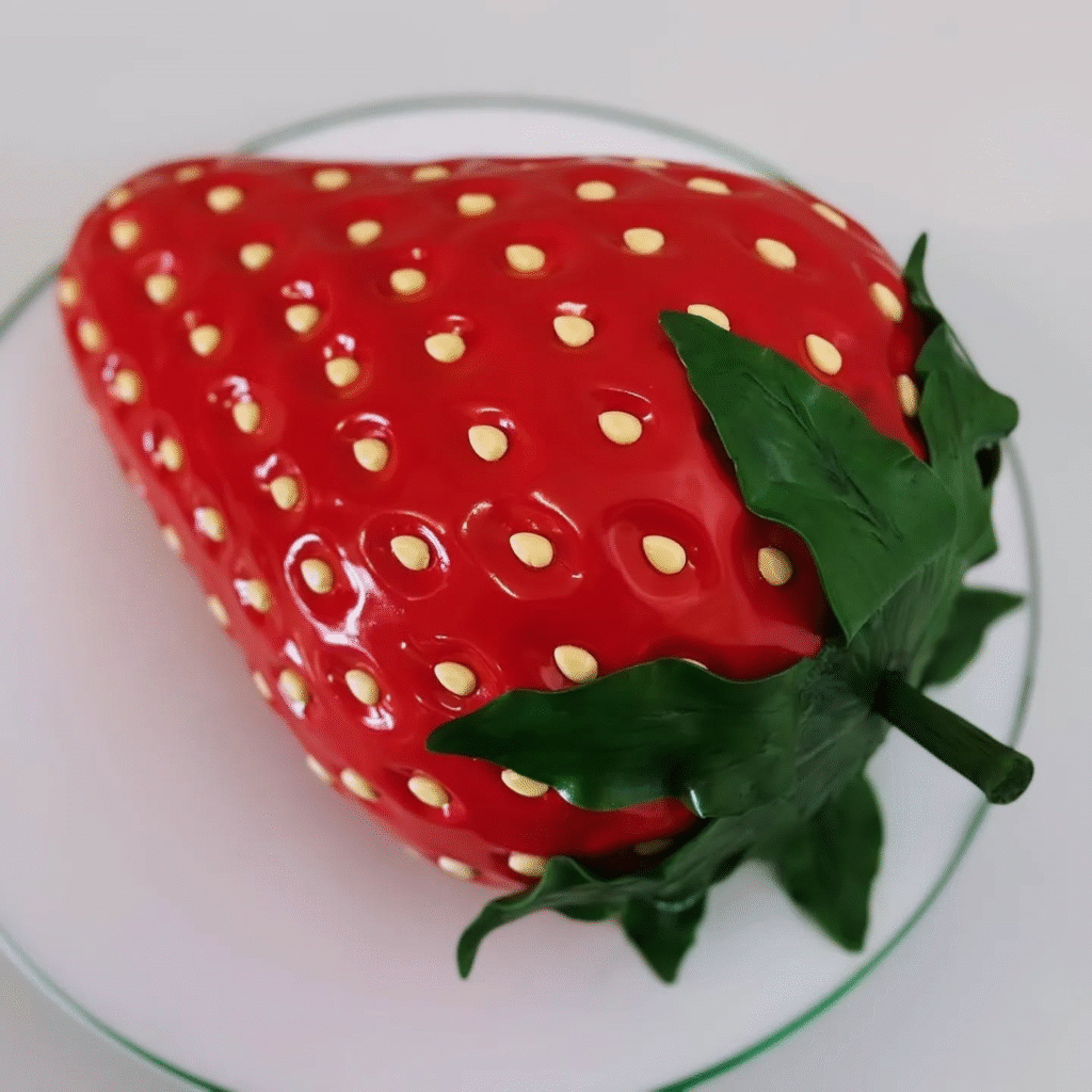 This cake is designed to resemble a perfectly ripe strawberry, complete with glossy red icing and intricate yellow seeds. The green leaves and stem give it a realistic, natural appearance, making it a true work of cake art.