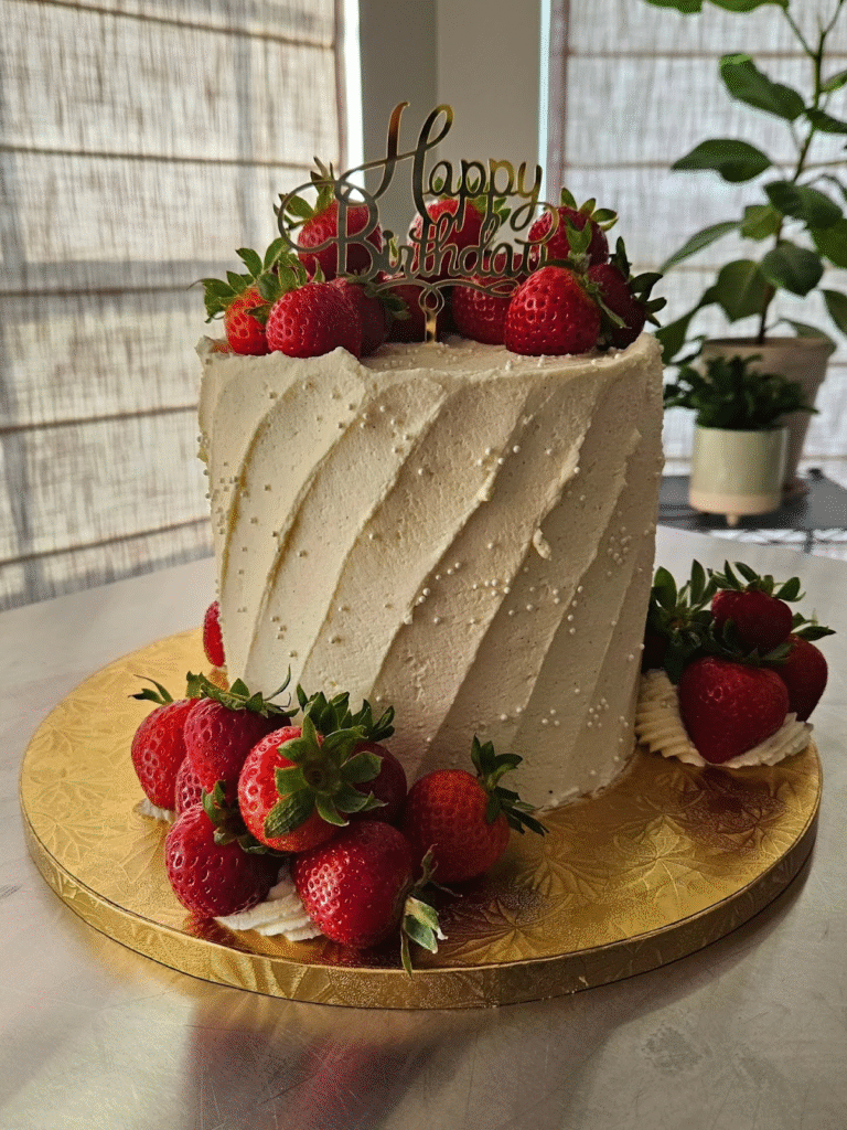 The cake’s classic look is enhanced by the smooth buttercream texture and vibrant strawberries, creating a fresh and luxurious vibe. The golden cake board elevates the overall design, making this cake an unforgettable part of any birthday celebration.