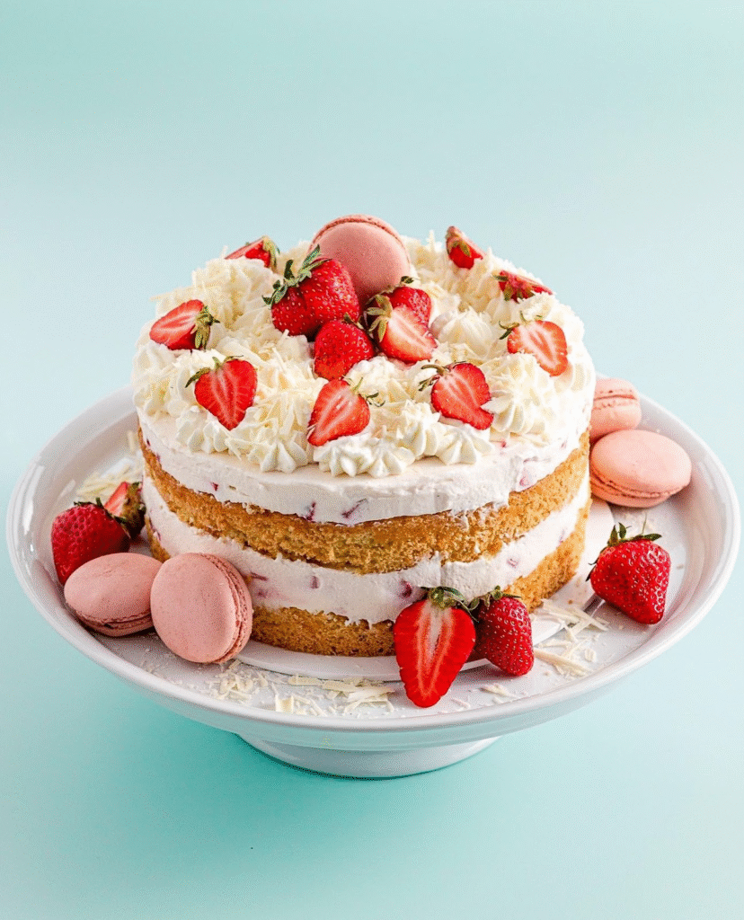 Light and Fresh Strawberry Macaron Cake with Cream