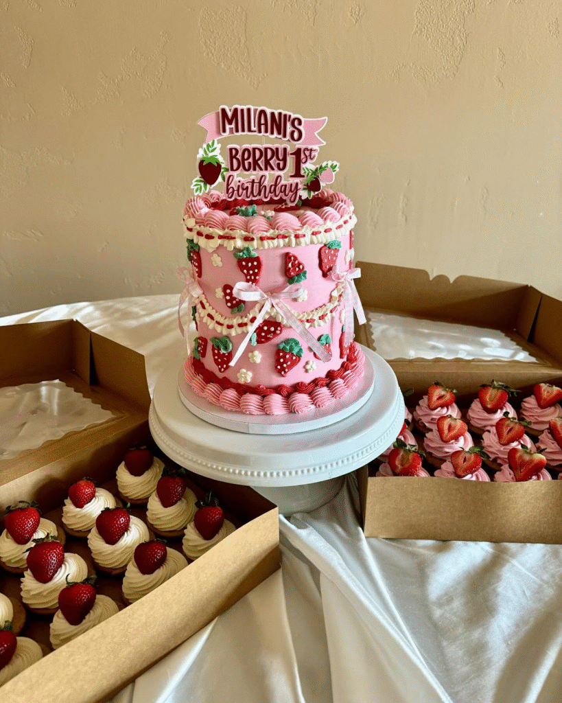 This strawberry-themed birthday cake features soft pink frosting, fresh strawberry decorations, and a fun topper that reads “Milani’s Berry 1st Birthday.” The charming ribbons add an extra touch of sweetness to this already delightful design.