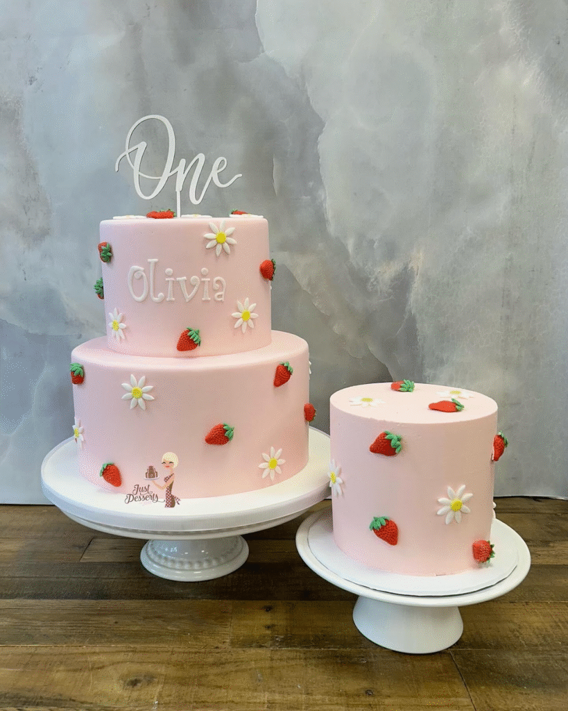 The soft pink frosting, combined with the fresh, vibrant strawberries, creates a playful yet elegant look. The daisies add a touch of whimsy, while the “One” topper gives it a personalized and special touch for the birthday girl.
