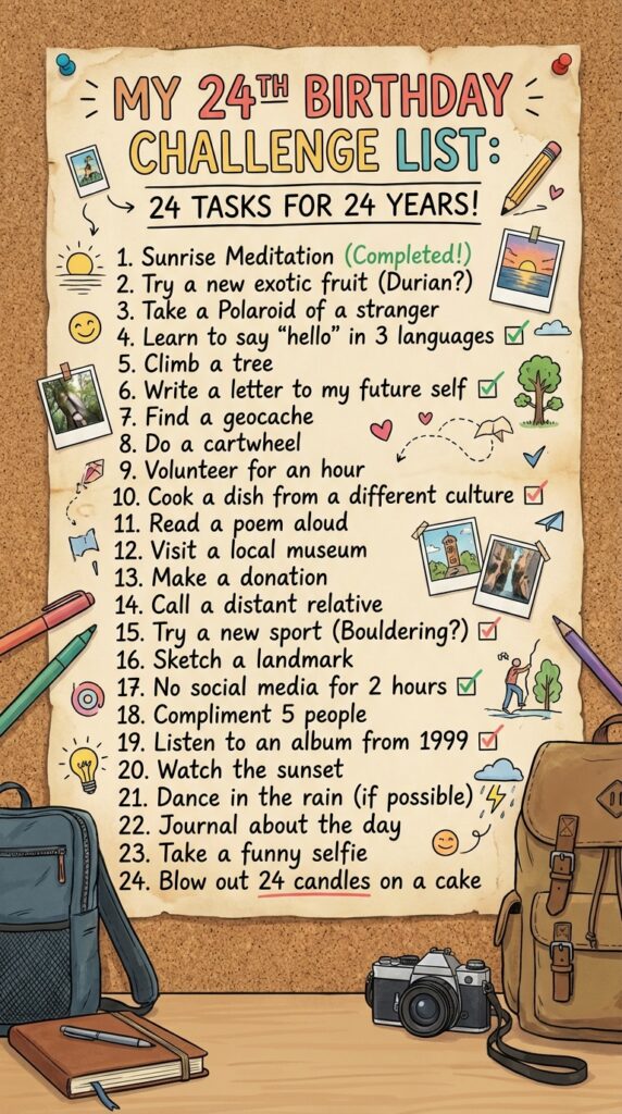 Evolve your 24th birthday into an extraordinary excursion by creating a personal challenge list with 24 unique tasks to accomplish throughout your special day. Take this milestone year to push your boundaries with activities ranging from sunrise meditation to trying exotic foods.