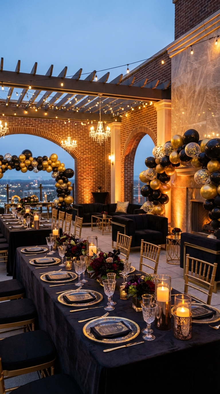 Consider booking a gold-accented venue, like Baton Rouge’s stunning gold luxury palace, to create an opulent atmosphere that’ll make your celebration truly unforgettable. Enhance the ambiance with elegant table settings featuring pristine white linens adorned with shimmering gold accents.