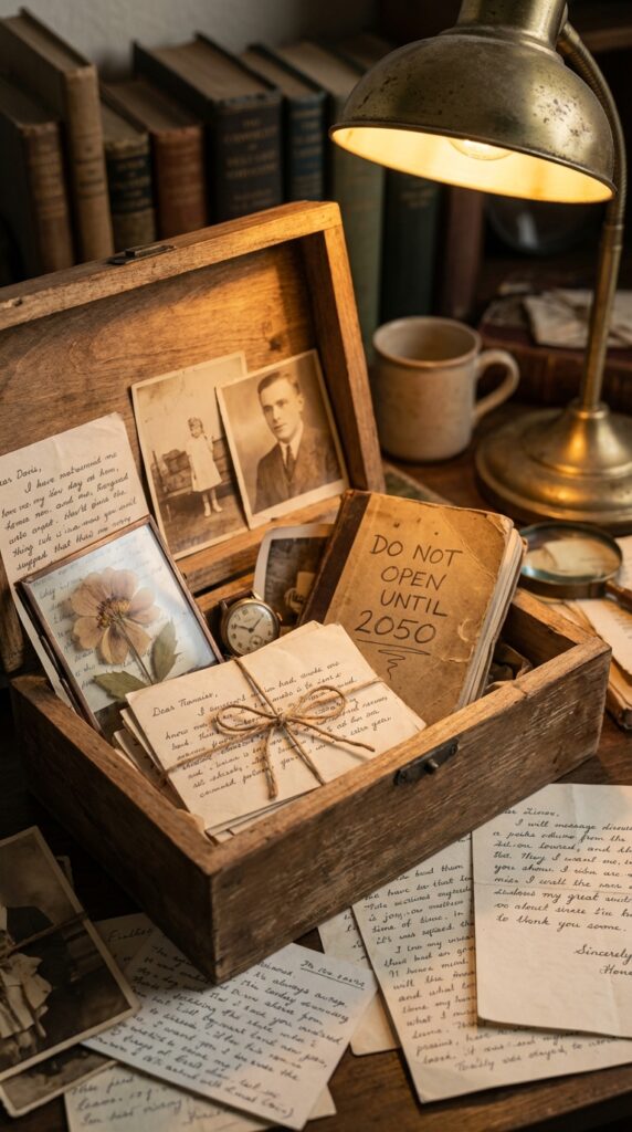 Start planning ahead of time by gathering meaningful items – photos, letters, and mementos that represent your life right now. Record a heartfelt message to your future self, and invite loved ones to contribute their own special items.
