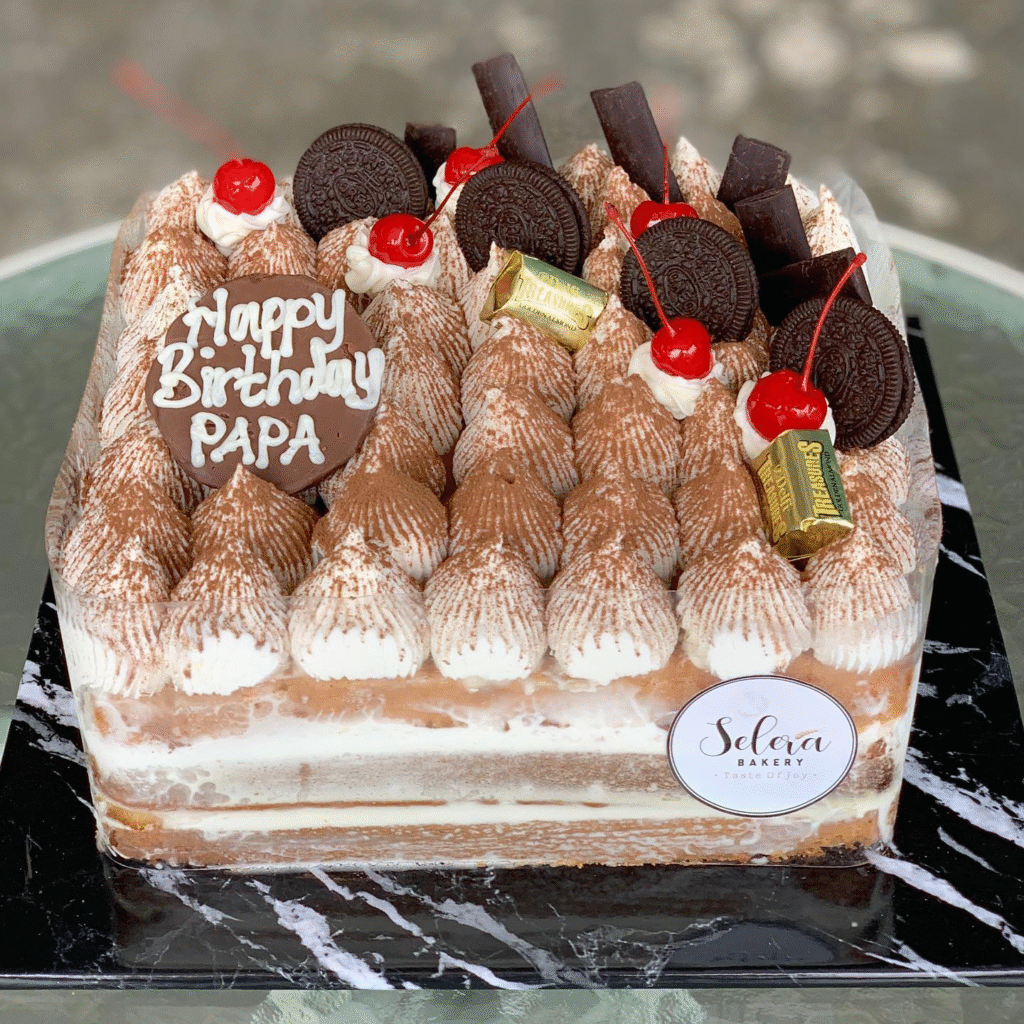 This indulgent birthday cake features layers of rich cream and a light dusting of cocoa powder. Topped with chocolate bars, Oreos, and cherries, it’s the perfect blend of textures and flavors. The “Happy Birthday PAPA” message on the chocolate plaque adds a personal touch, making it ideal for a celebration.