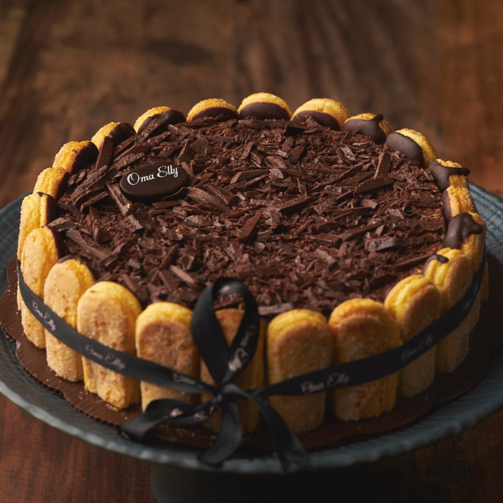 This stunning ladyfinger cake features a beautiful design with soft ladyfingers lining the sides, complemented by a layer of rich chocolate shavings on top. The dark chocolate accents and delicate chocolate plaque with “Oma Elly” add a touch of elegance.