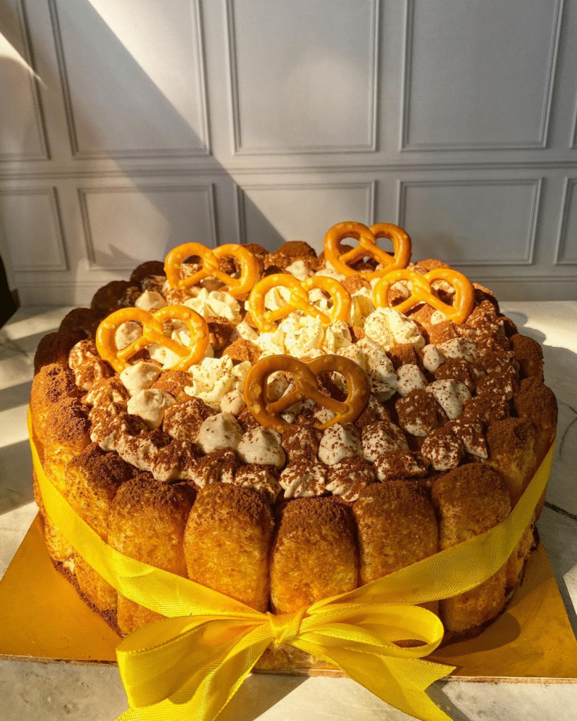 What Makes This Image Stand Out: The pretzels and yellow ribbon give this Tiramisu cake a unique, stylish touch that enhances both its visual appeal and flavor.