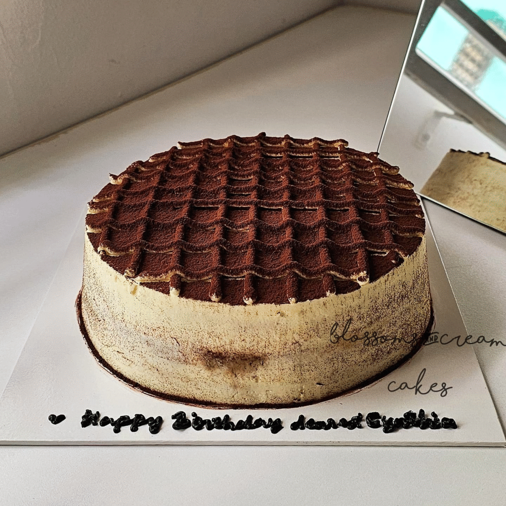 What Makes This Image Stand Out: The grid pattern and rich, creamy exterior, along with the simple “Happy Birthday” message, give this tiramisu cake a timeless and appealing design.