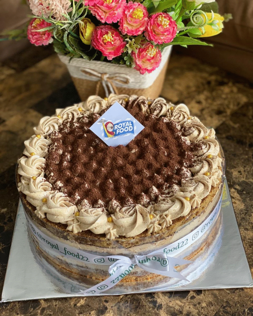 The cake is topped with a “Royal Food” branded card, adding a touch of elegance. The fine ribbon and polished finish make this dessert not only delicious but also visually captivating, perfect for a sophisticated birthday celebration.