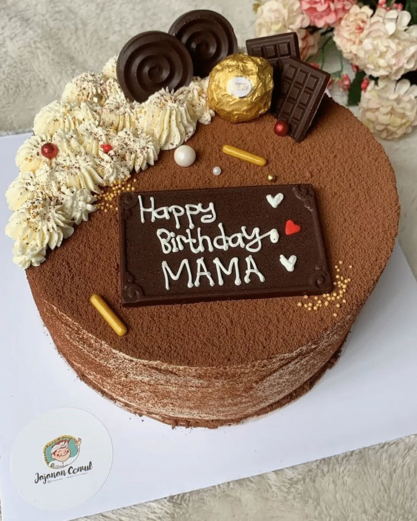 This chocolate-themed birthday cake features an elegant arrangement of chocolate swirls, a Ferrero Rocher, and chunks of rich chocolate bars. A lovely border of whipped cream adds texture, while the personalized “Happy Birthday Mama” plaque brings a sentimental touch.
