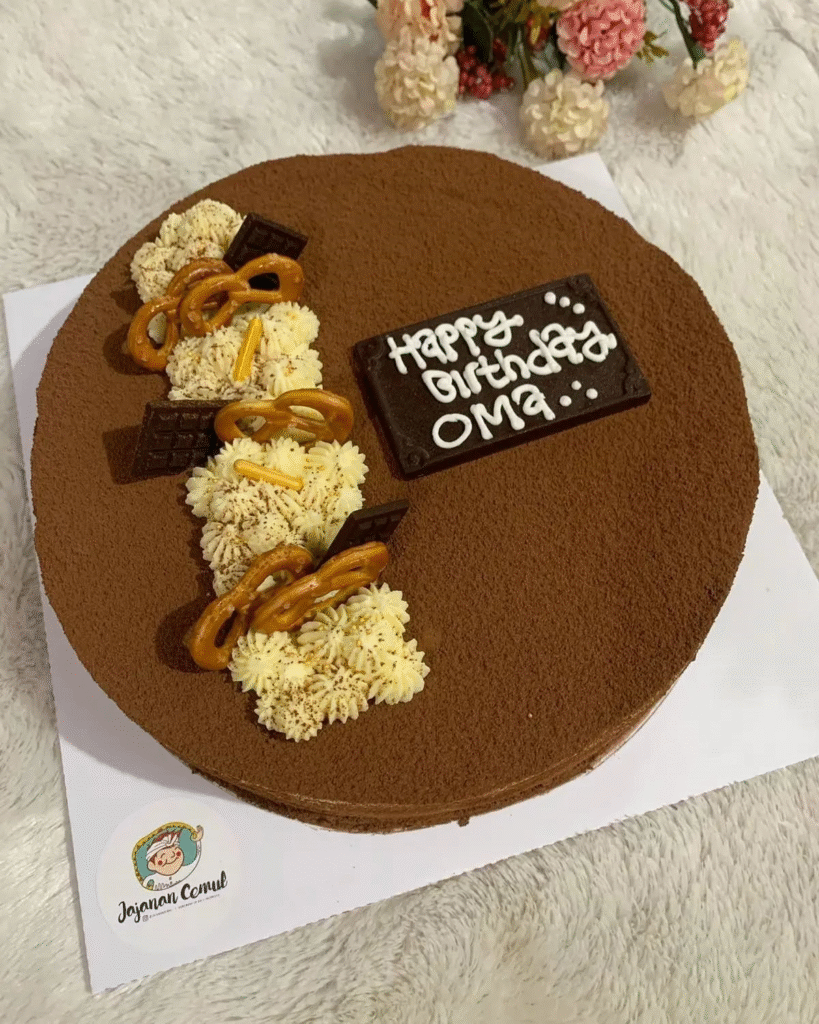 This stylish birthday cake features a chocolate base topped with creamy whipped frosting and decorated with crispy pretzels and chocolate accents. The “Happy Birthday Oma” inscription adds a heartfelt, personal touch. The mixture of textures, from smooth frosting to crunchy pretzels, makes it an unforgettable treat.