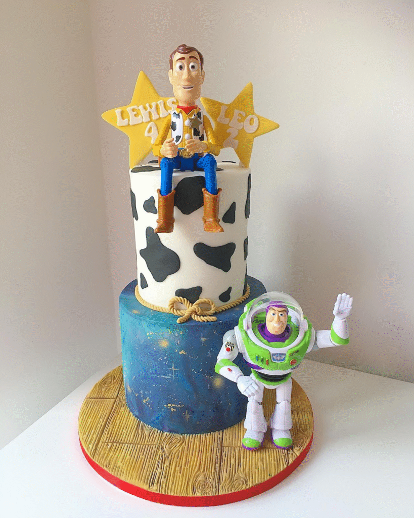 This charming two-tiered Toy Story cake features Woody and Buzz Lightyear on top, surrounded by a colorful, fun design. The top tier showcases Woody’s cow print shirt and sheriff badge, while the bottom tier brings Buzz Lightyear’s colors to life with bright green, blue, and red elements.