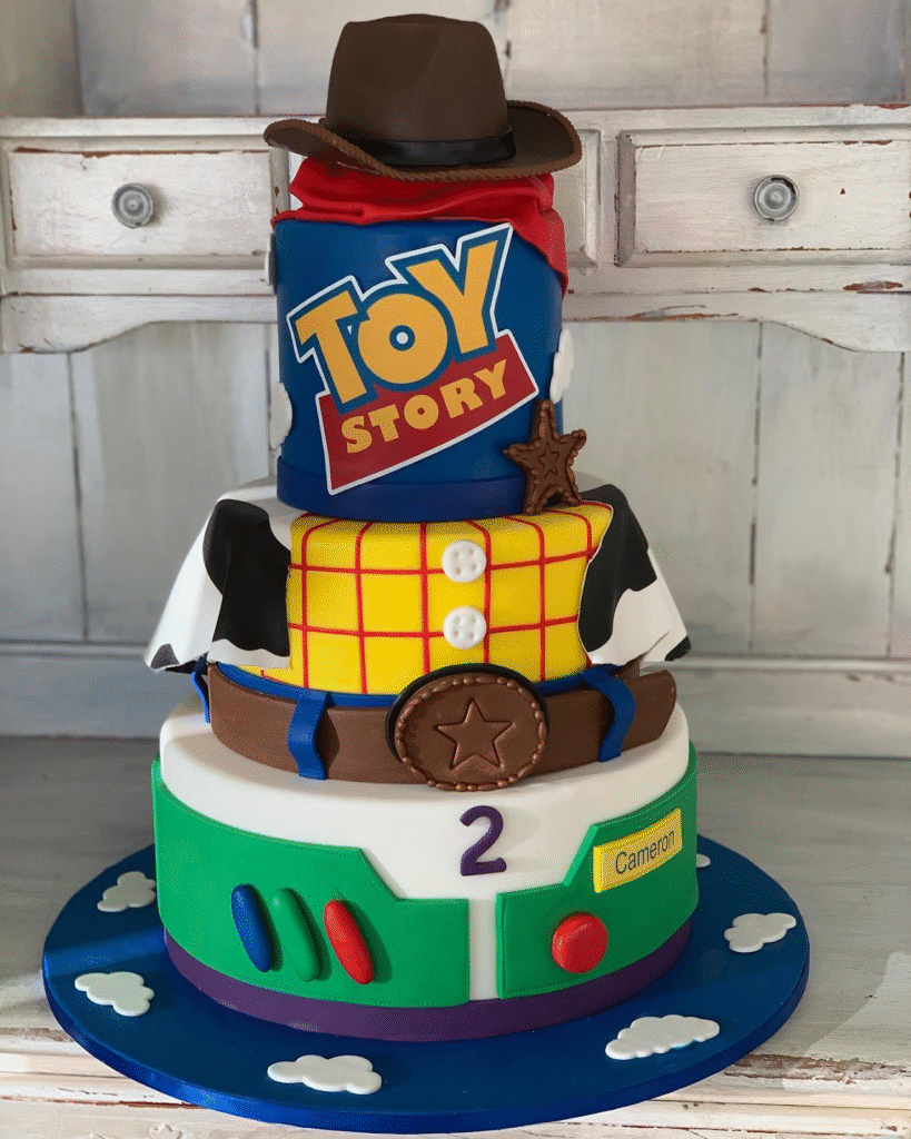 This creative Toy Story cake showcases an exciting three-tier design that perfectly captures the spirit of the beloved movie. The top tier features a toy box design, with “TOY STORY” and a cowboy hat, while the middle tier mimics Woody’s iconic shirt and belt, complete with a sheriff badge. The bottom tier, inspired by Buzz Lightyear, features his signature green, blue, and red colors.