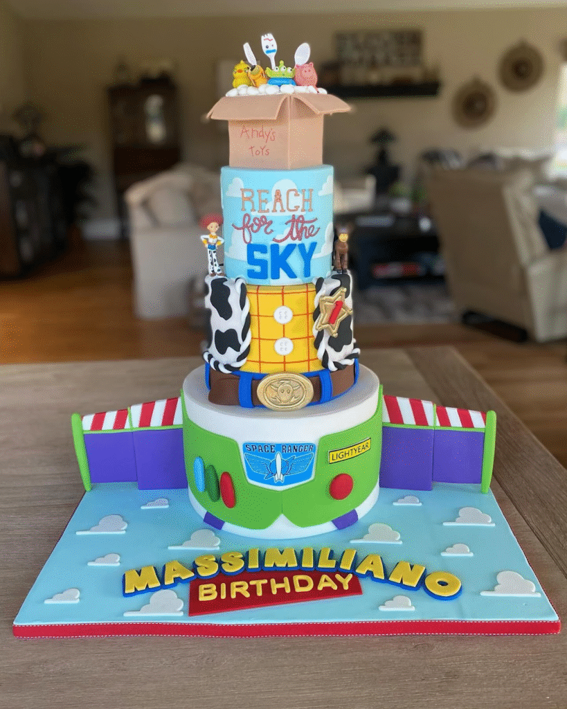 This Toy Story cake takes creativity to the next level with its two-tier design and colorful details. The top tier features a toy box with “Andy’s Toys” and “Reach for the Sky” messages, while the middle tier showcases a fun cow print pattern and a sheriff’s badge. The cake’s base incorporates the Space Ranger logo, celebrating Buzz Lightyear’s heroic adventures.