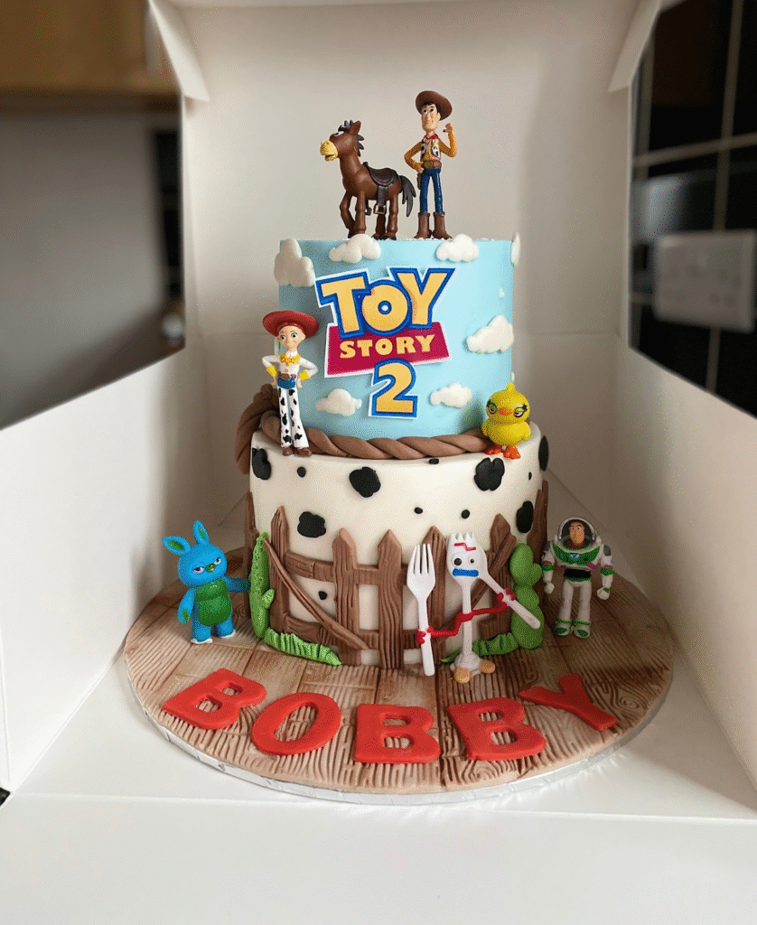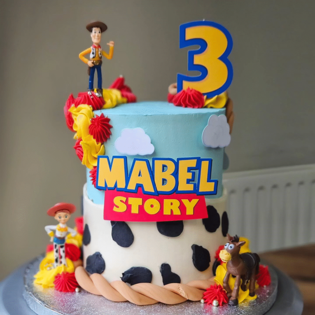 This lively Toy Story cake features a colorful, whimsical design. The top tier is adorned with Woody, while the bottom tier, covered in cow print, brings in Jessie and a horse. The “MABEL STORY” logo adds a personalized and bold touch, perfect for a young Toy Story fan’s birthday.